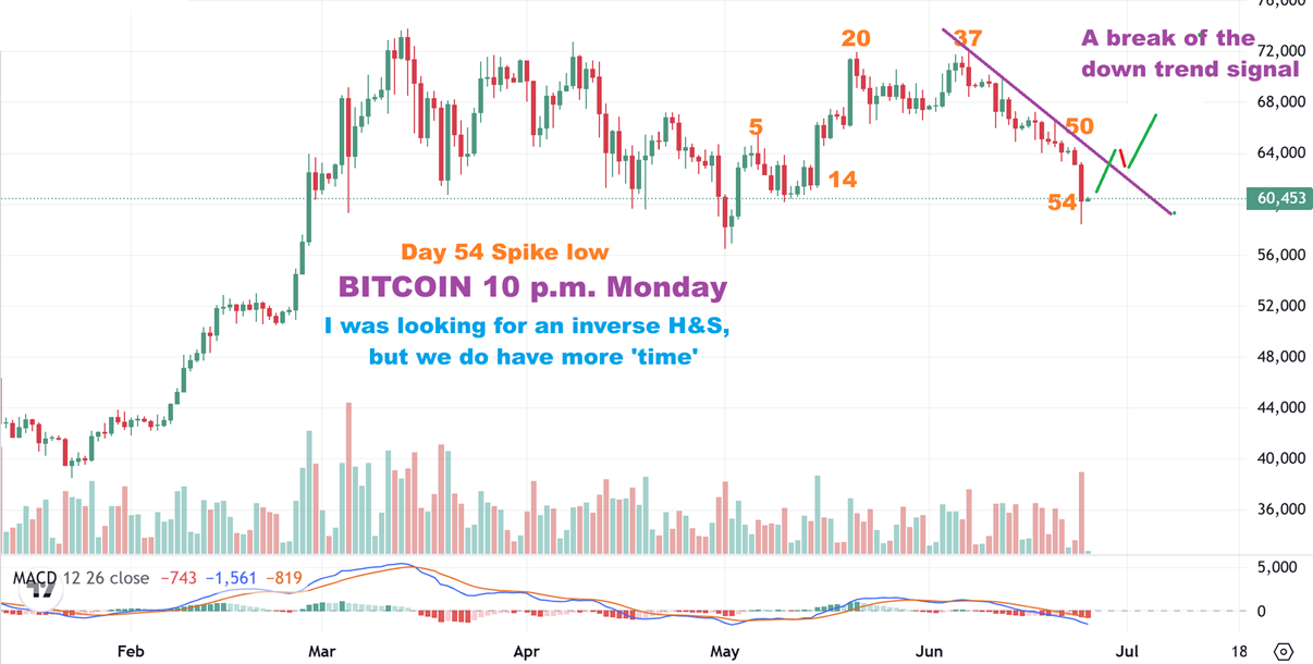 BITCOIN DAILY WEDNESDAY : Bitcoin broke down and has recovered and today it is pausing so far. That would be a day 54 low, and that might be the dcl, since it formed as a high volume plunge and the selling has now dried up. Time will tell.