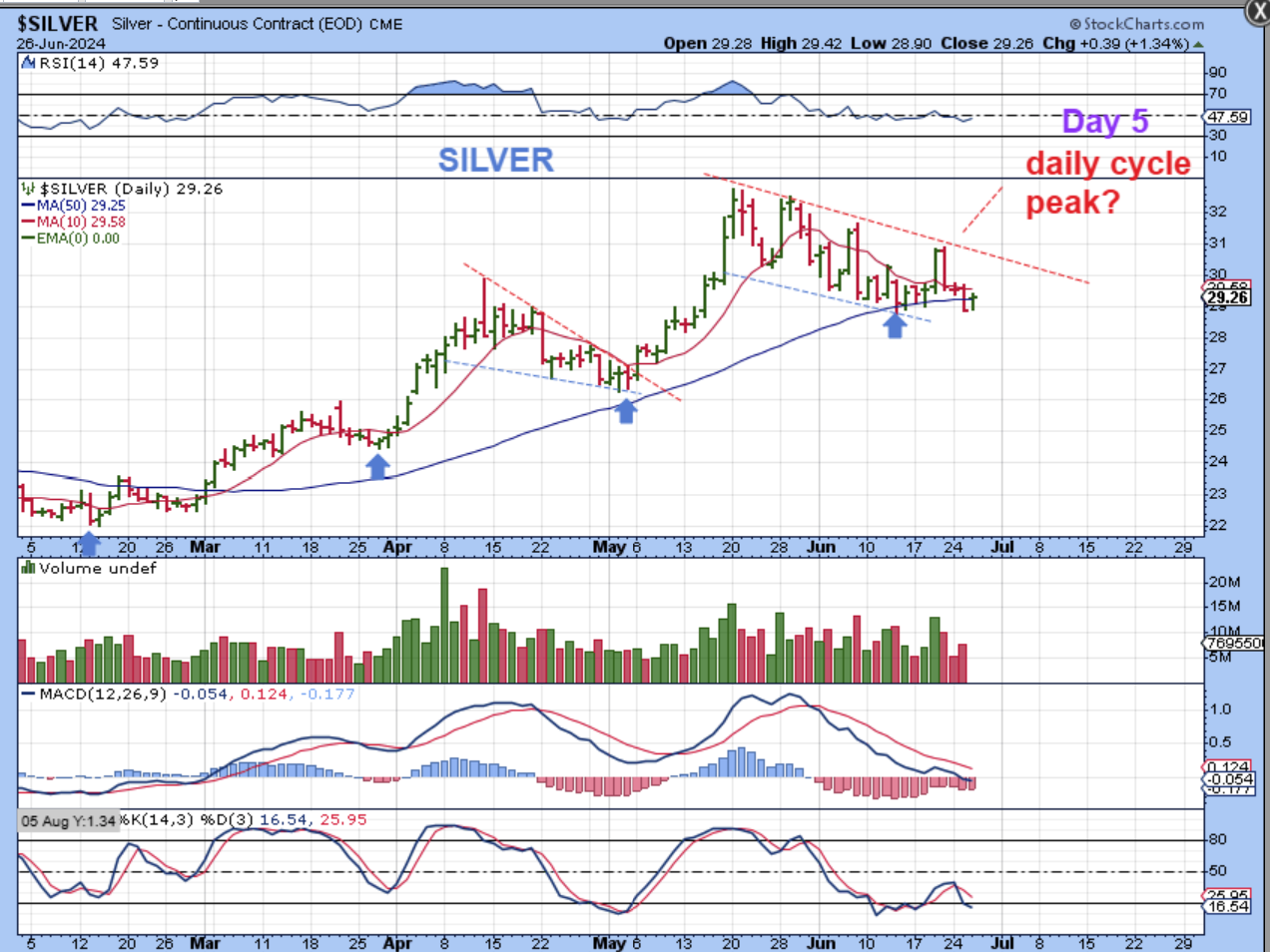 SILVER has chopped sideways, and this indecision is making it very difficult to see where the dcl is, but I marked an arrow 8 days ago and we have a peak, so far, on day 5.