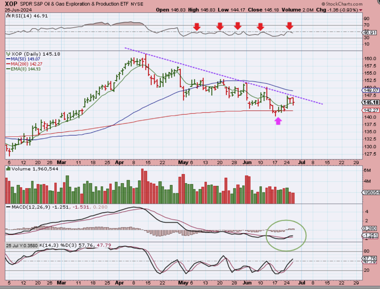 THE XOP has reversed at the downtrend line. We do see a bullish MACD cross over, so it is likely just a matter of time before it starts to follow Oil higher.