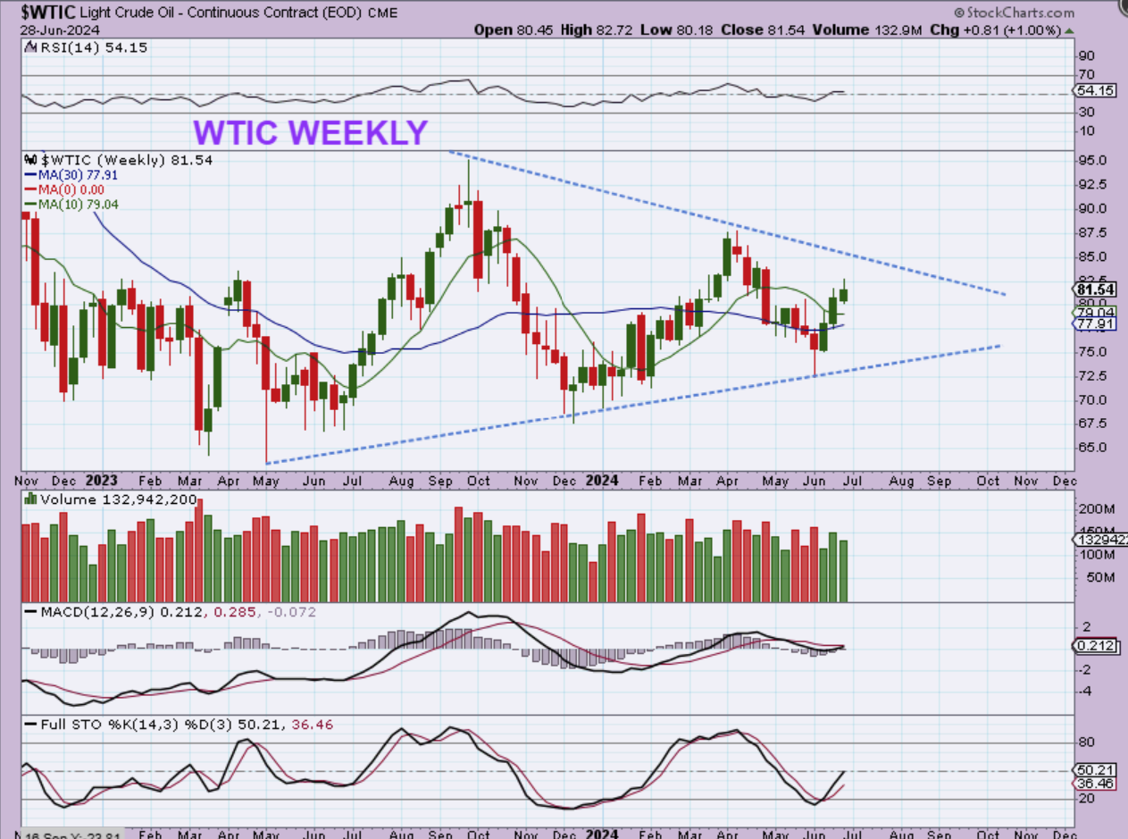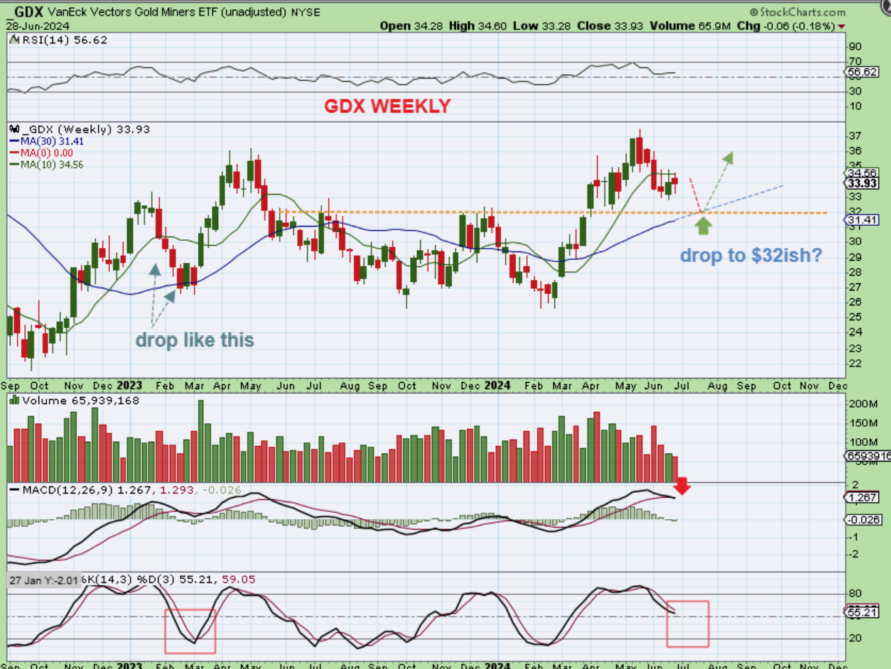 GDX WEEKLY- The miners can drop down suddenly, and we had 1 drop from the peak already. Currently the selling paused, but I can see this going lower again, and I’m watching that $32 area as a 30 week ma target and the orange support line falls in that area too. Price can slightly overshoot, like we saw back in February 2023.