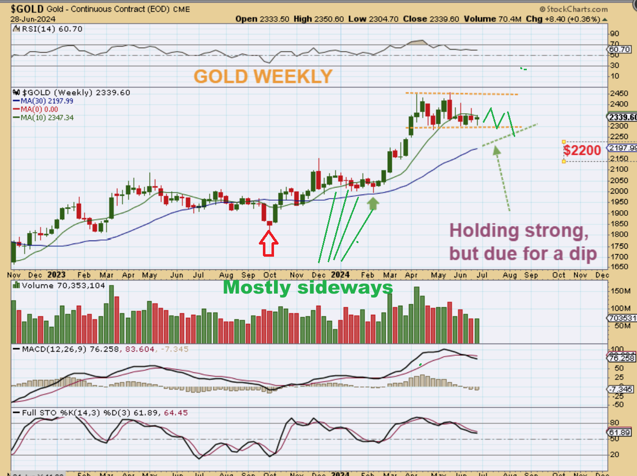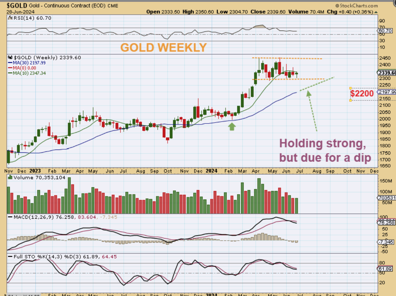 GOLD is due to dip lower into a dcl or ICL with the 4th daily cycle, but it has been holding up well. We could see a small bounce and then a drop into that 4th daily cycle and the $2200 area looks like a normal pullback area to watch going forward (30 week ma).
