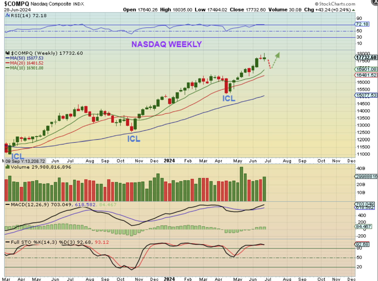 NASDAQ WEEKLY– I see 2 weekly reversal candles. It could be a rather mild dip, maybe down to the 10 week ma area.