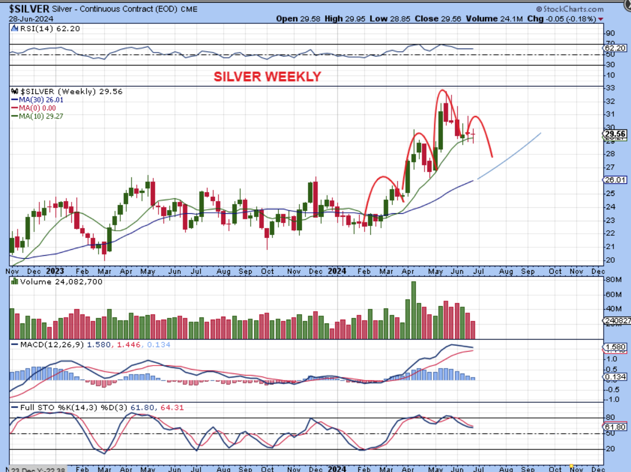 The SILVER Weekly price has dropped down to the 10 week ma and has now chopped along that 10 week ma for 3 weeks. I also feel that it could drop even lower with this daily cycle.