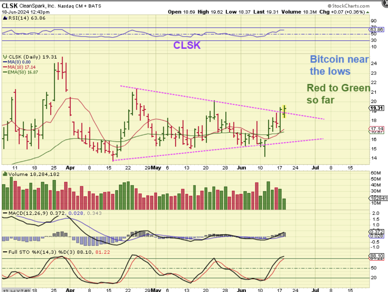 I pointed out repeatedly that $14 or $16 is ‘a low price buy point for CLSK’, to hold in a basket. Earlier this week I showed this chart, where CLSK is trying to break a downtrend line too THIS HAPPENED AS BITCOIN DROPS.
