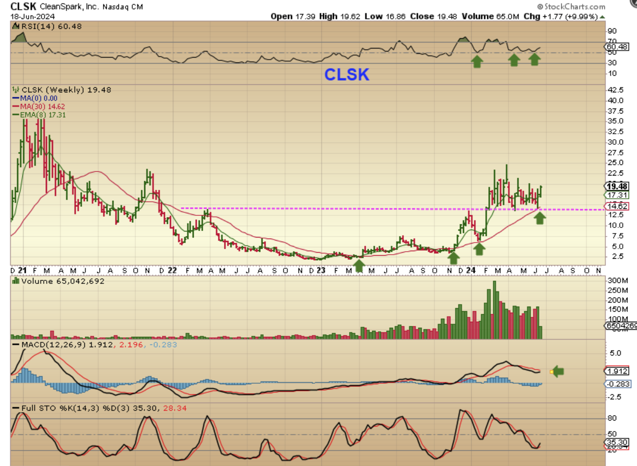 CLSK WEKLY- 2 weeks green. So now I look at the weekly chart and it has chopped sideways ABOVE a recent break out (that was as it was holding the $14 and $16 support areas). CLSK just tagged that 30 week ma and reversed higher too (Bullish), and has nice volume, so CLSK may be preparing to launch soon too. Remember: This 2 week climb came with Bitcoin dropping.
