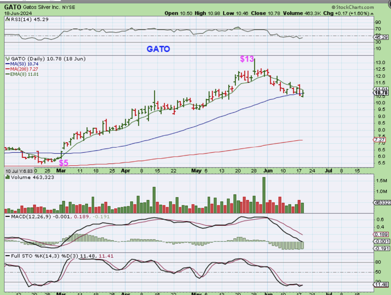And GATO has done it again: $5 to $13 and a pullback to $10. If it pushes above the 50sma, it could be bought with a stop too.