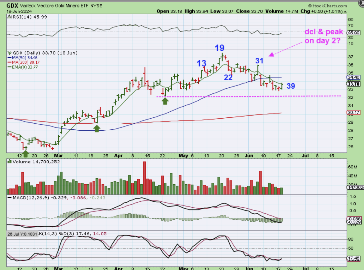 GOLD slammed down on day 25 and ever since then, it is slowly climbing higher. We are on day 34, or we saw a dcl on that slam down and this is a weaker 4th daily cycle. I noticed that some Miners look nice at this point in time, so I’ll cover a little of that too.