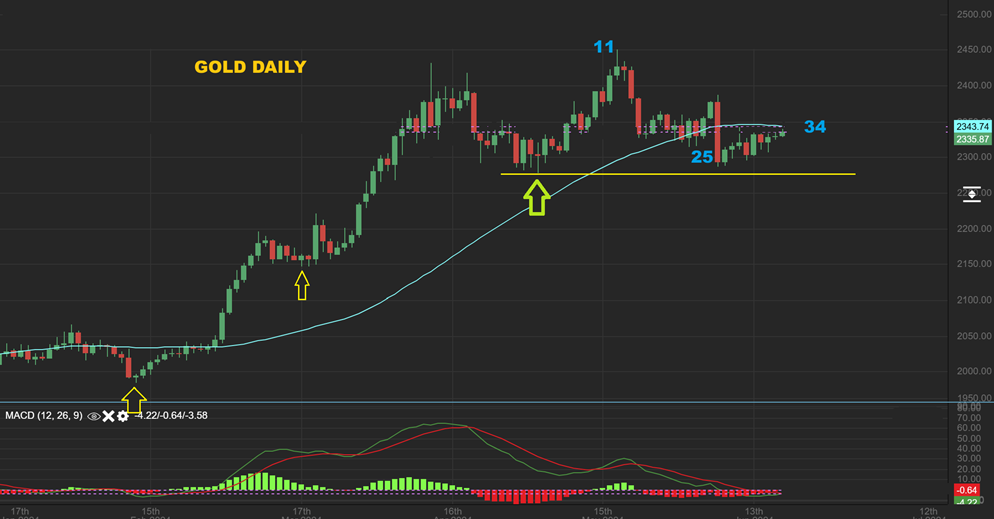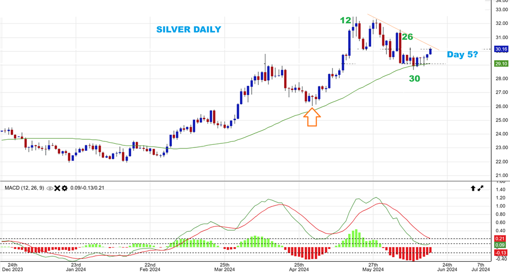 SILVER is interesting with a day 30 low and a push higher this week giving us a swing low. It could be day 5 of a 4th daily cycle, and it looks ready to break higher, but the 4th daily cycle should be a weaker one. You COULD buy this or Silver stocks with a stop and wait and see.
