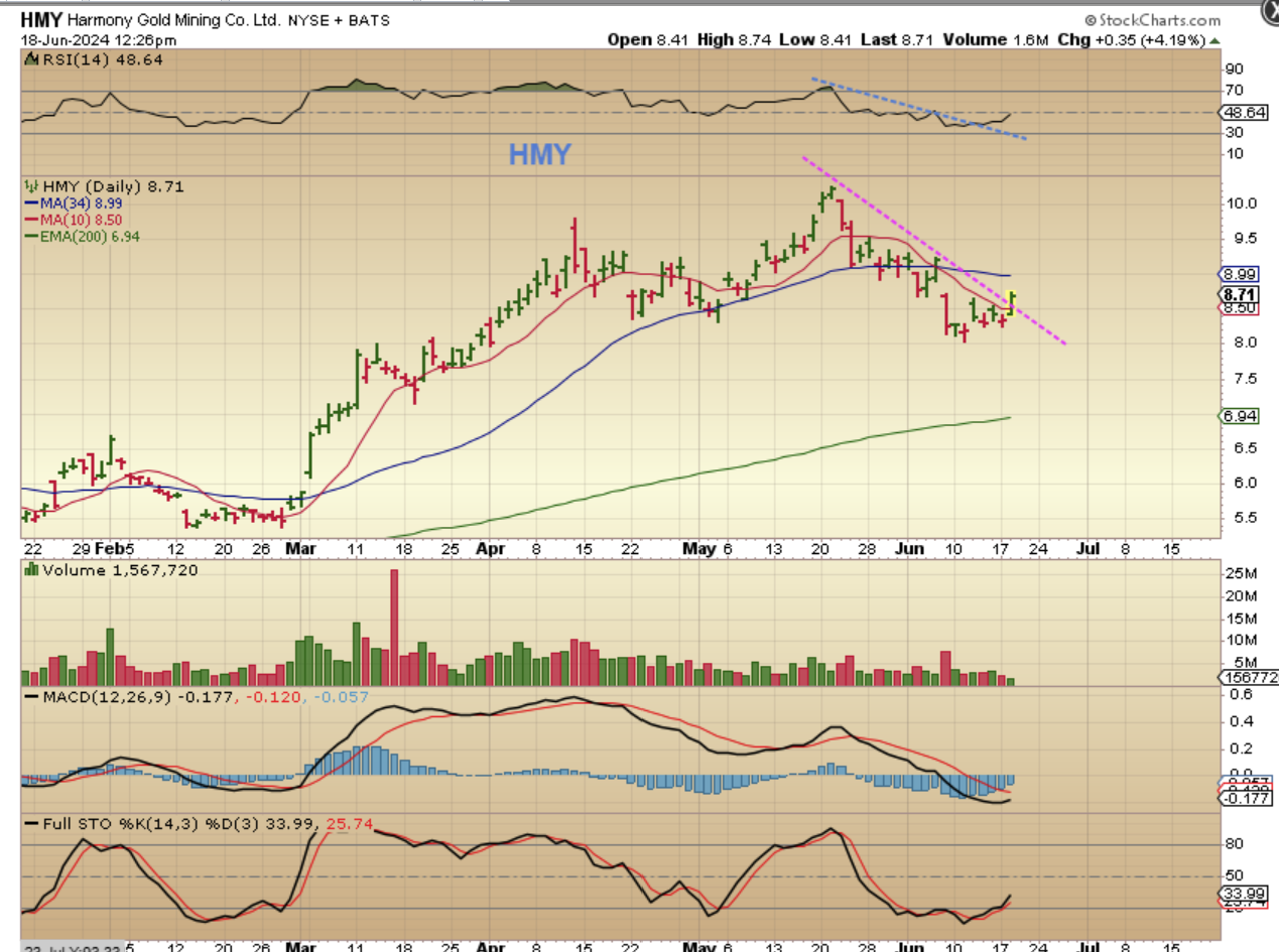 HMY sold off for 2 weeks, but it is improving and broke a downtrend too, so that may be the sign of a dcl too. That may not make this a buy though, if this is a 4th daily cycle, it could crawl under the 50sma and get rejected.