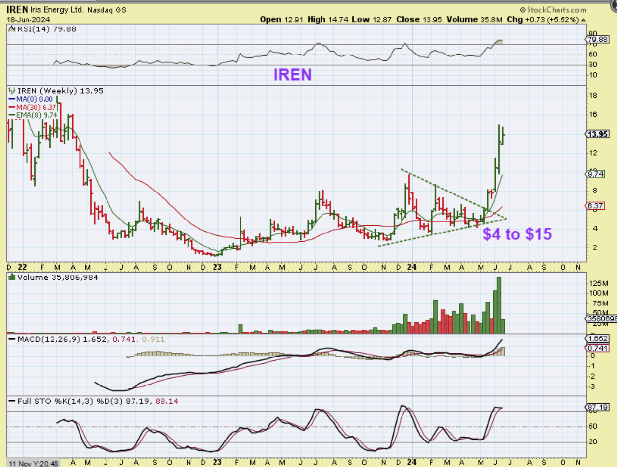 THE WEEKLY IREN chart gave us a downtrend break or triangle break and it ran strong with High volume.
