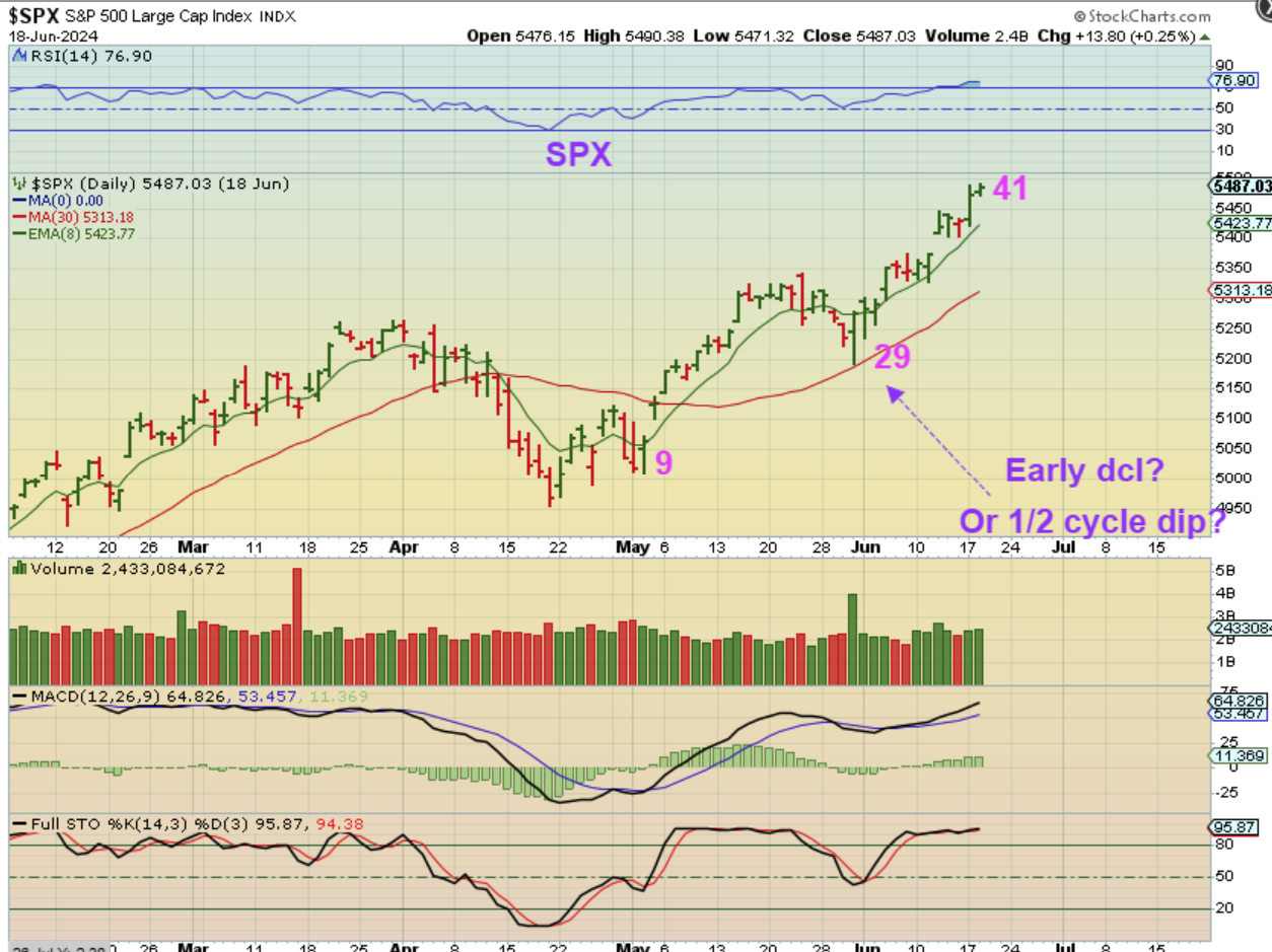 Some daily cycles have been 50 days long, others have been around 38 or so. With that I have asked, “COULD WE have had a dcl at day 29 and this is the 2nd daily cycle?” Maybe, but I think it is still the first daily cycle and if it is, we should be coming due for a dip into a dcl at any time, so we would raise stops to the 8 ema.