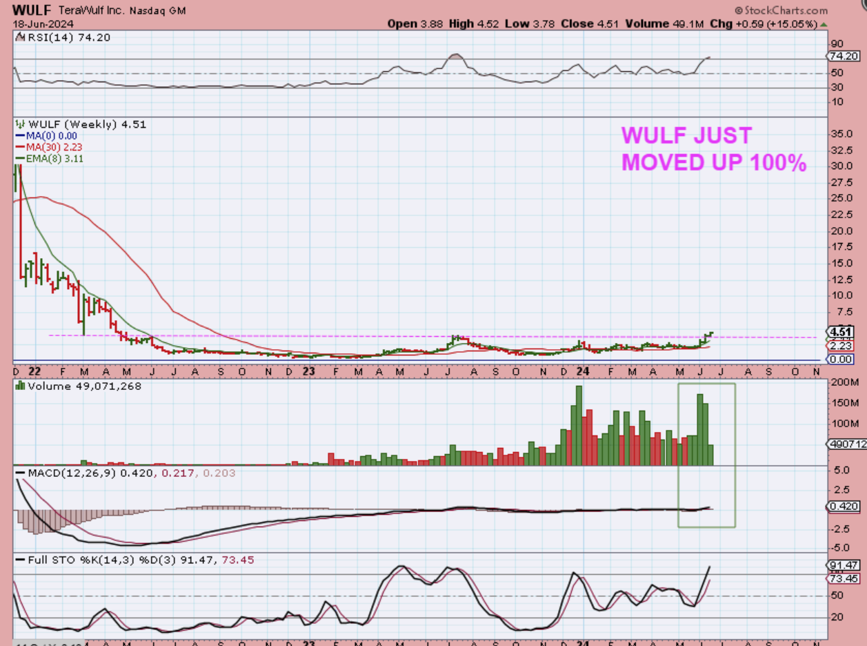 WULF WEEKLY has volume surging as it looks like it is just starting to leave this massive base that I used to show, so…