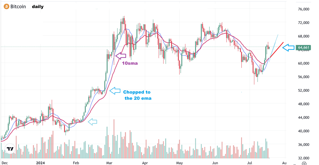 There are times when Bitcoin chops sideways and moves over to the 10sma, and there have been times that it ‘pauses’ and works its way all the way over to the 20 ema too. That can take from a few days to even 2 weeks. I pointed that out on this chart, please take a look at the arrows.