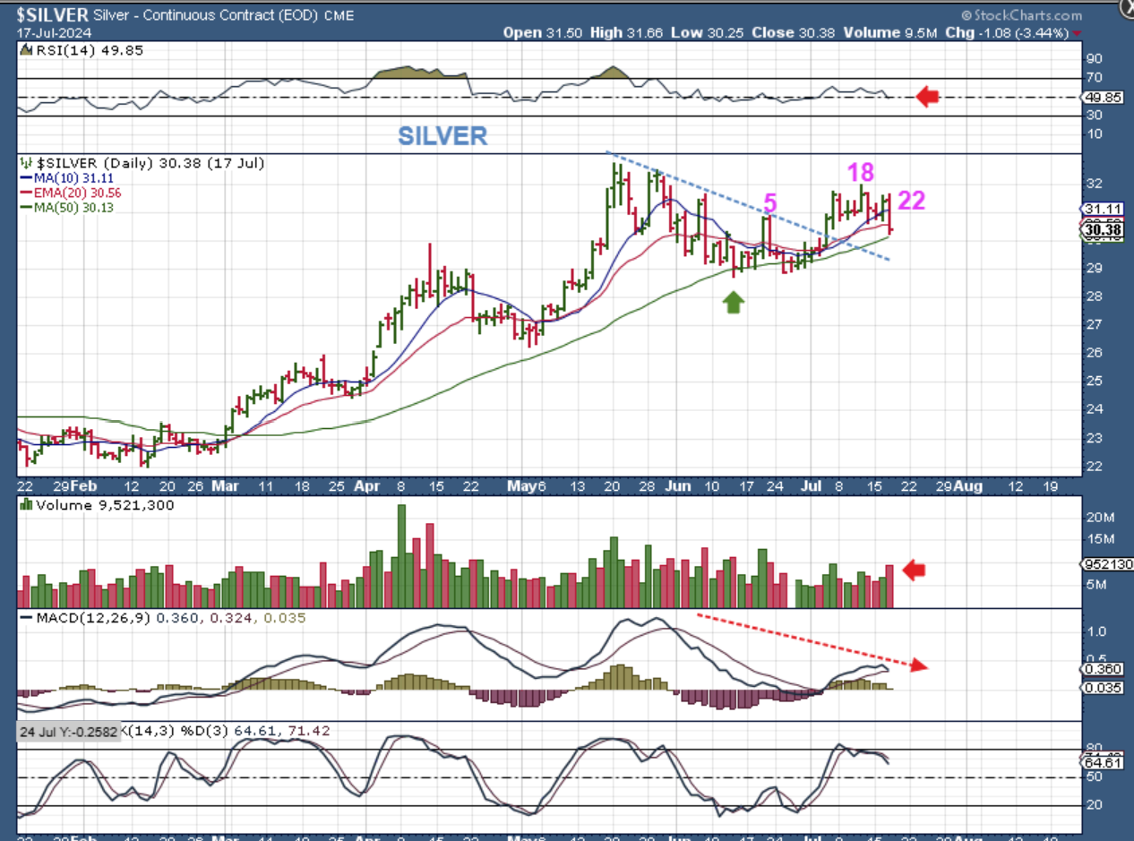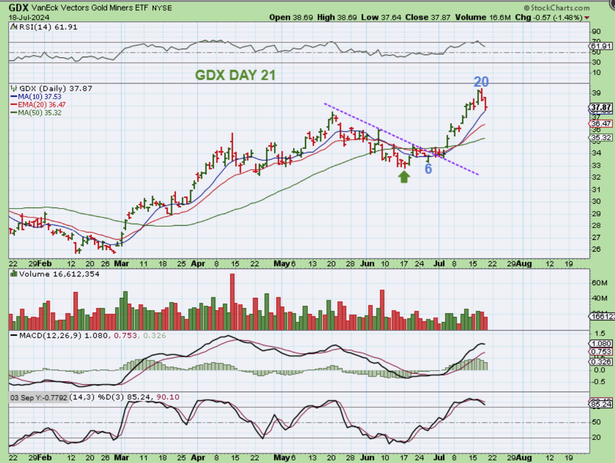 THE GDX ETF or The Miners were strong and we saw a nice rally that has, so far, peaked on day 20. This is now experiencing a drop to the 10sma, but Silvers chart makes it look like we will see more of a pullback. I will say this….
