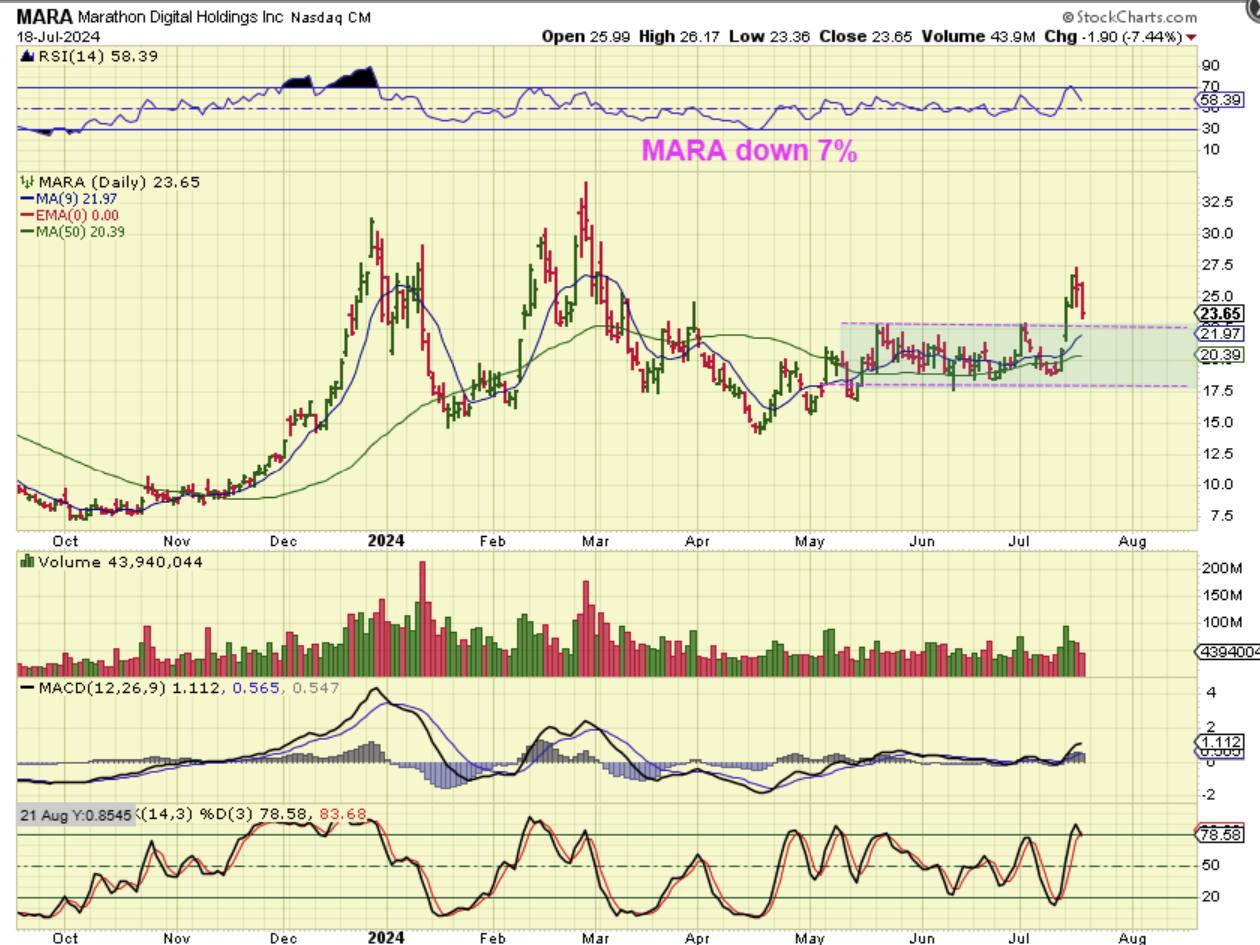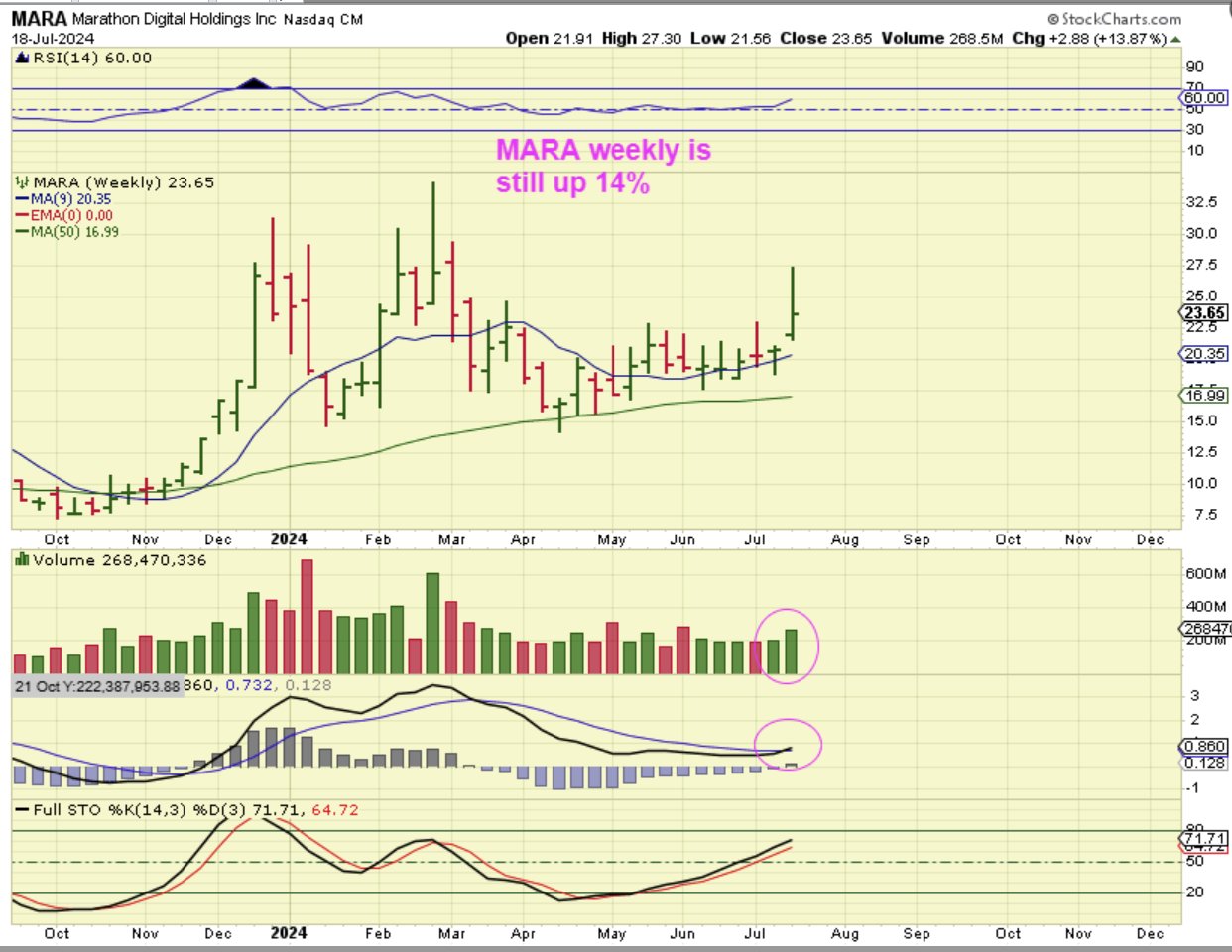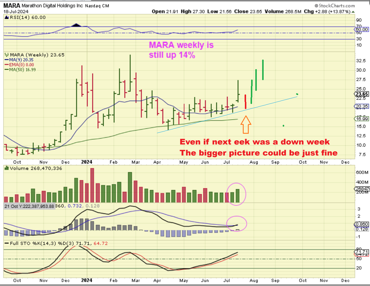 MARA #3: The Weekly Chart. Well, Mara is actually still up 14% for this week alone and the chart looks good at this point, so one could say that by the time Bitcoin gets to former highs in that $70,000 area, MARA could be back at $33 too. In other words…