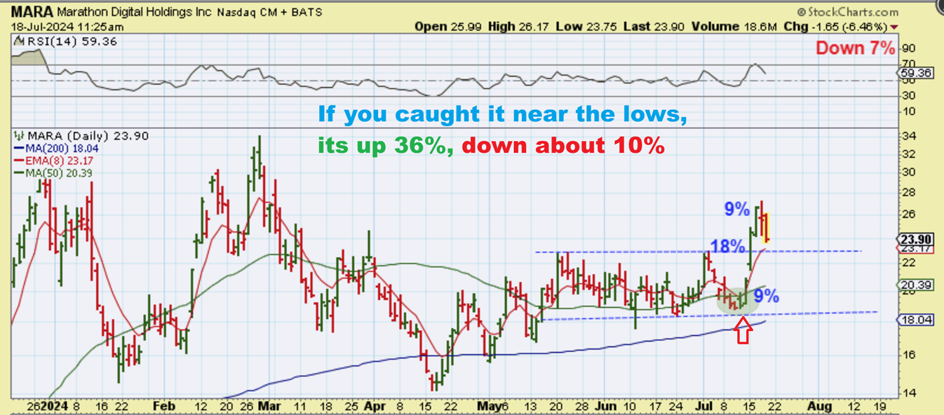 MARA#2 : I got into MARA early as Bitcoin was around day 60ish, so the gains were 3 days of 36%, now I give back 10% from the peak. Again, that doesn’t seem bad either, right? However, if Bitcoin chops sideways to the 20 ema for 4 more days, will this slow up? Or will this drop another 10% and then another to reach that 50sma? It is hard to know. Let’s look at another view…