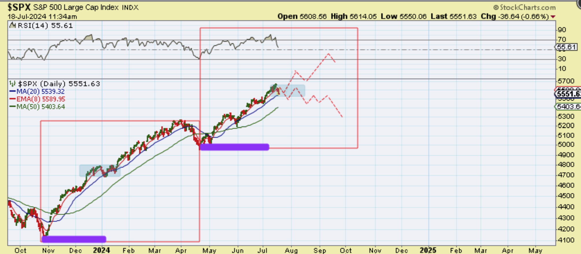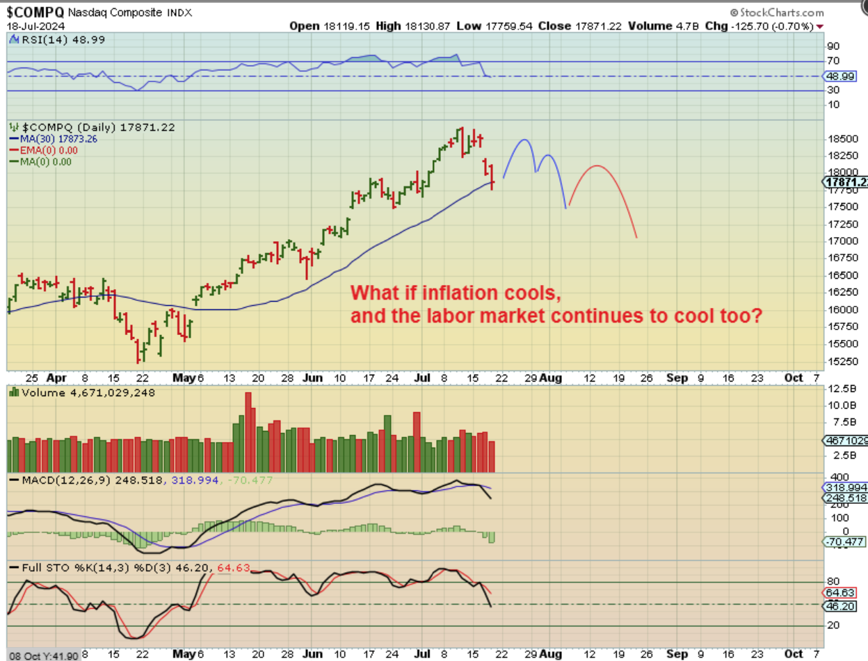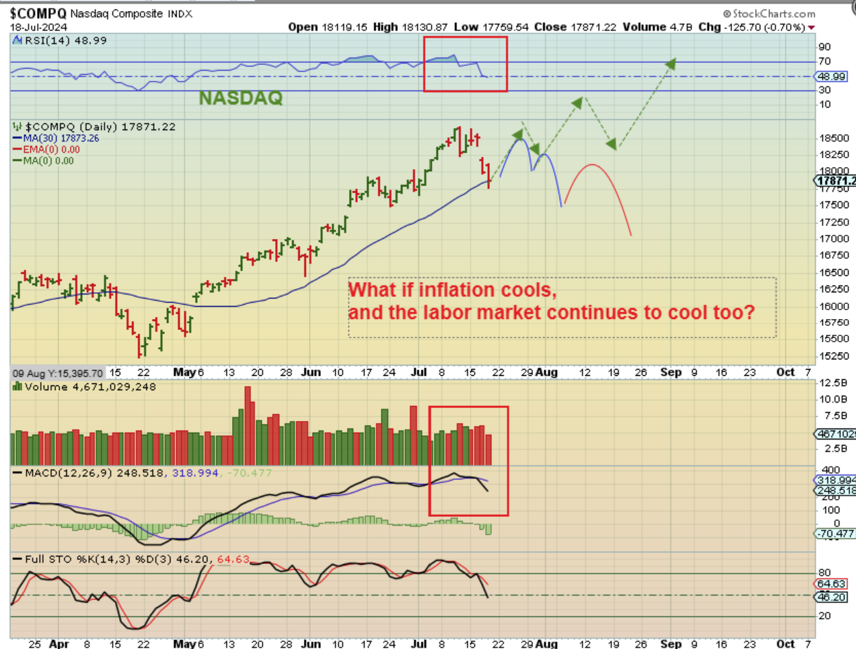 NASDAQ – The Jobless Claims Report showed a higher number of employment claims than expected. This also increases the chances of a rate cut, but it might signal that the economy is weaker than it was last year at this time and it could continue to weaken going forward. This could weaken the bull run, and the path could get choppier, as shown here. We’ll see.