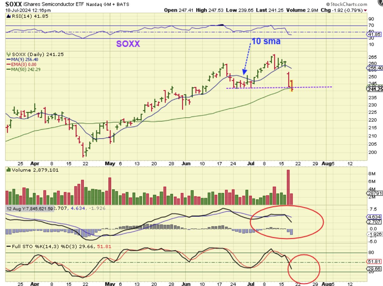 I saw The SOXX break the 50sma and it also seems to have broken the last dcl. That would be a failed daily cycle, calling for a sell down to lower lows over time. This is somewhat important to me, because the semis often lead the markets. I will say that the SOXX reversed and closed back above the 50sma (shake out?), so today is important for the SOXX.