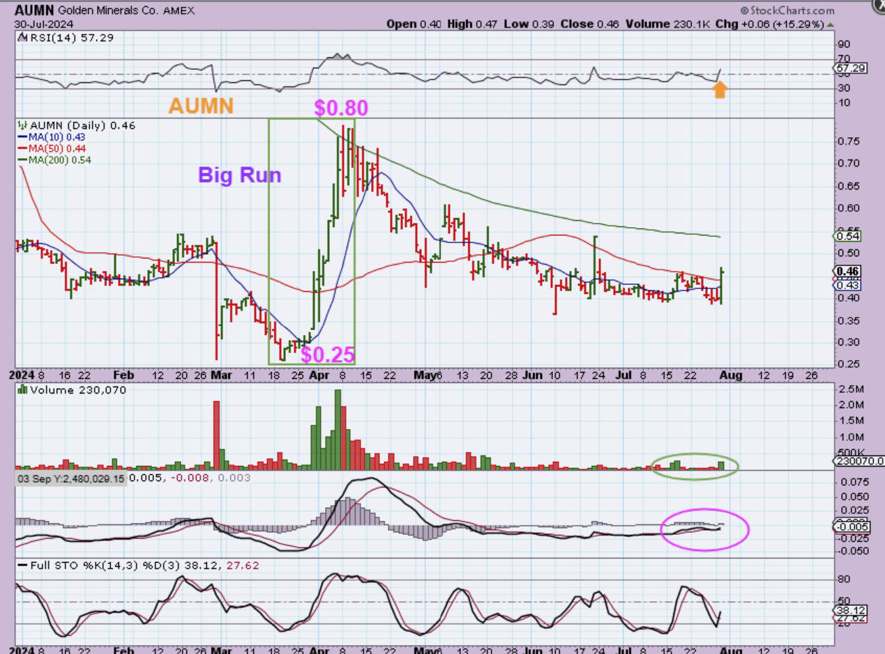 At the close AUMN held 15% of the gains and I actually like this set up, since it did rally swiftly in April too. It tripled then.