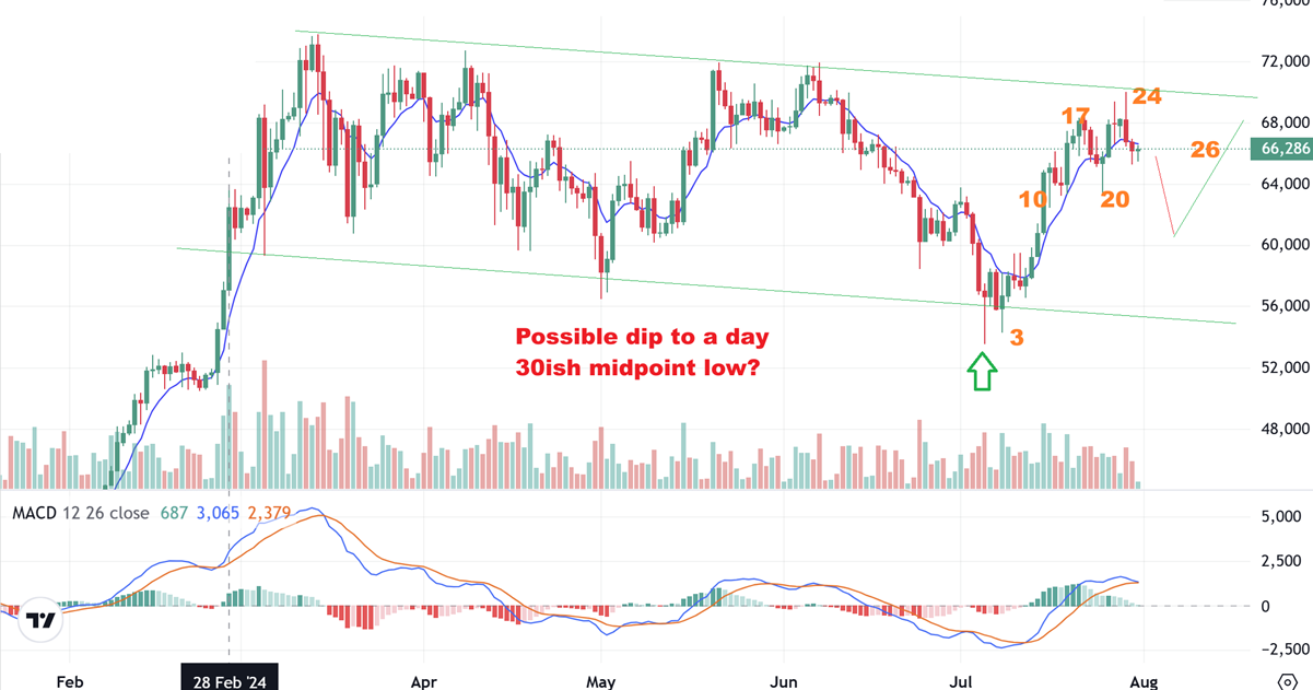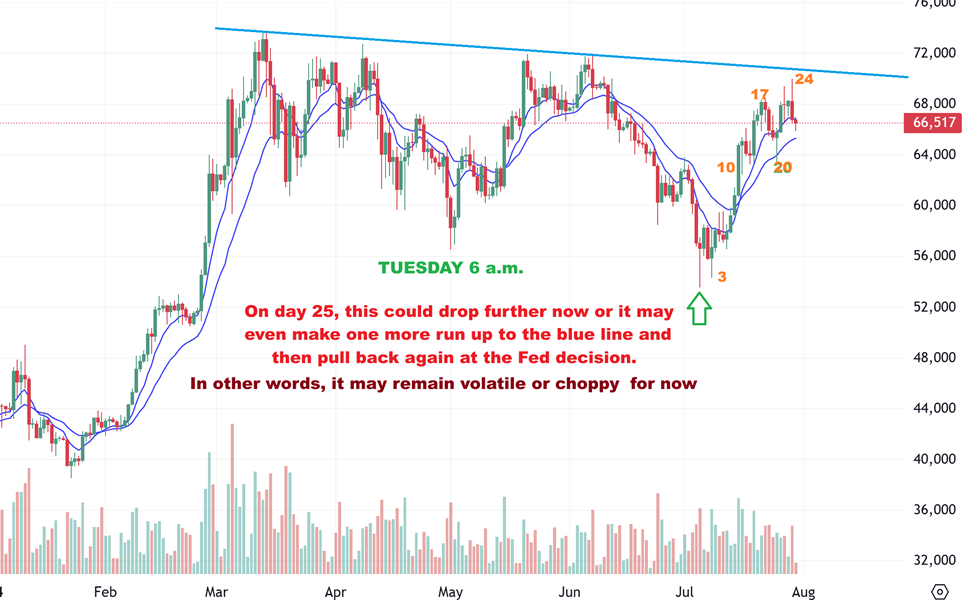 This is Bitcoin on Tuesday morning and I see a tiny reversal trying to form after dipping to the $65,000 area overnight. Is that it for the dip around the day 30 area? Maybe or maybe not. I would have expected a dip down to that day 20 area, but this may just chop around until after the fed mtg too. For now, it has become choppy up near the upper down trend line, and that was to be expected as the day 30 time period approached. Crypto Stocks remain lack luster (for now). Maybe they’ll run after a breakout to new highs.