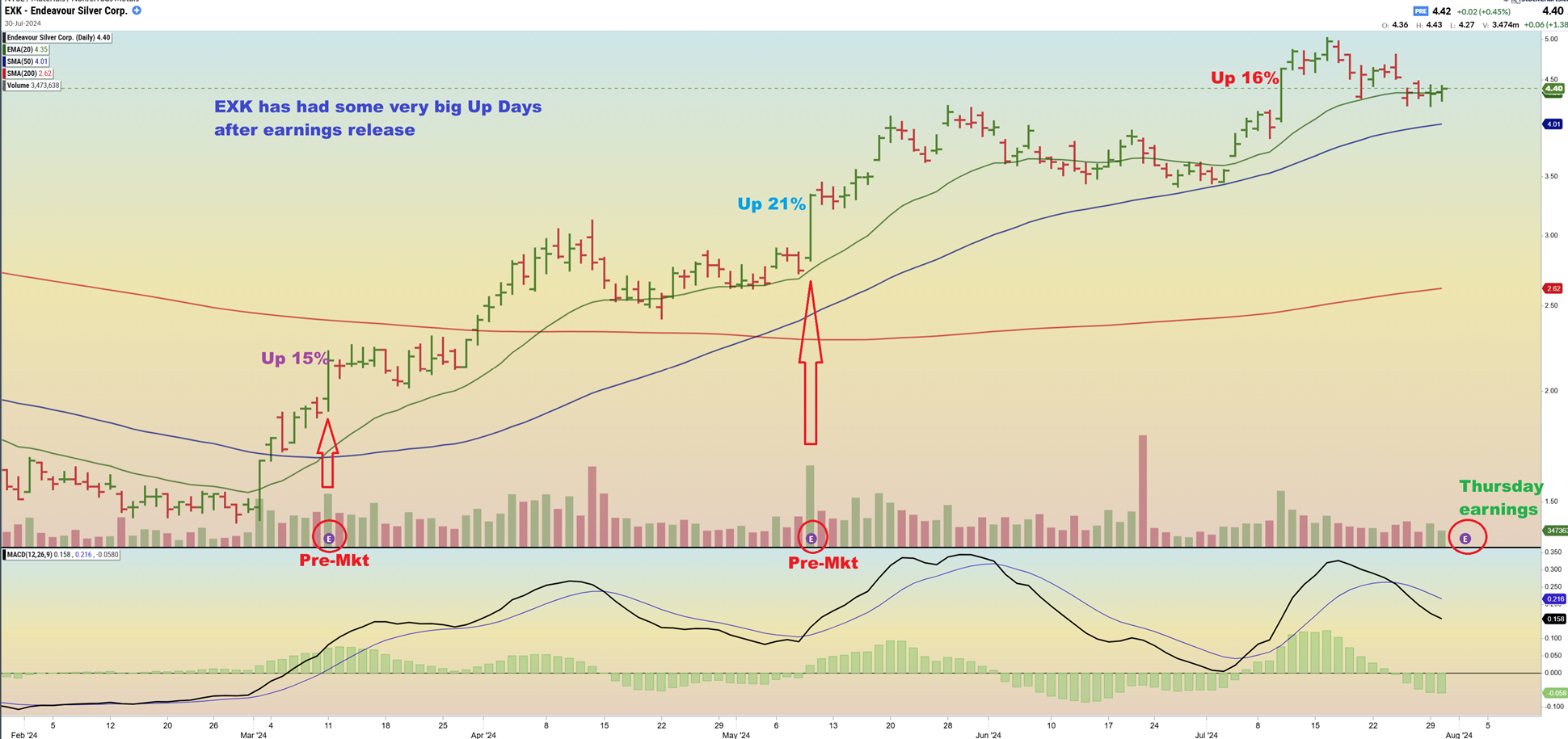 Here I just want to show you what I noticed about Past EXK Earnings. Each time EXK had pre-market earnings release, it rallied 15-21% that day. EXK has earnings due out on Thursday. Could it be different this time & sell off? Of course, but from what I see here, this might be a good time to buy some EXK if you don’t already own some. I expected a tag of the 50sma on Fed Wednesday, but again, EXK did not sell off like Silver did either.