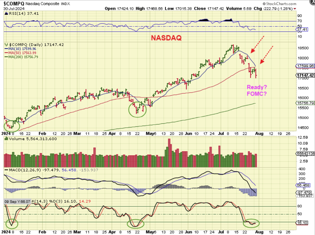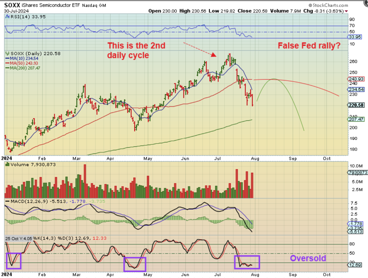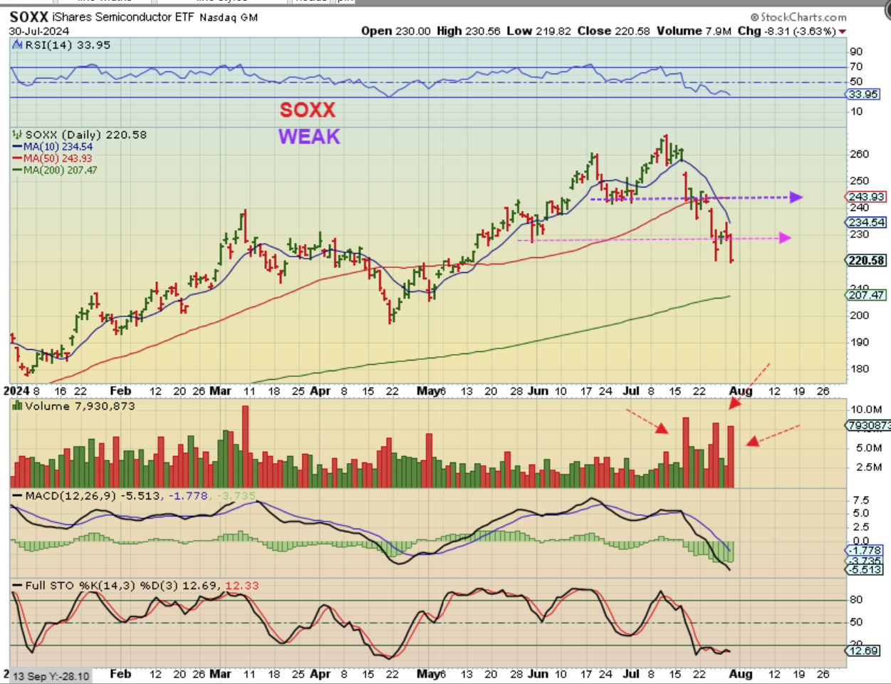 THE SOXX is what concerned me and alerted me to failure and weakness in the semiconductor sector. This is real volume so what happens from here with the Fed Mtg and what should be a rather bullish discussion of a rate cut in the future? Well…