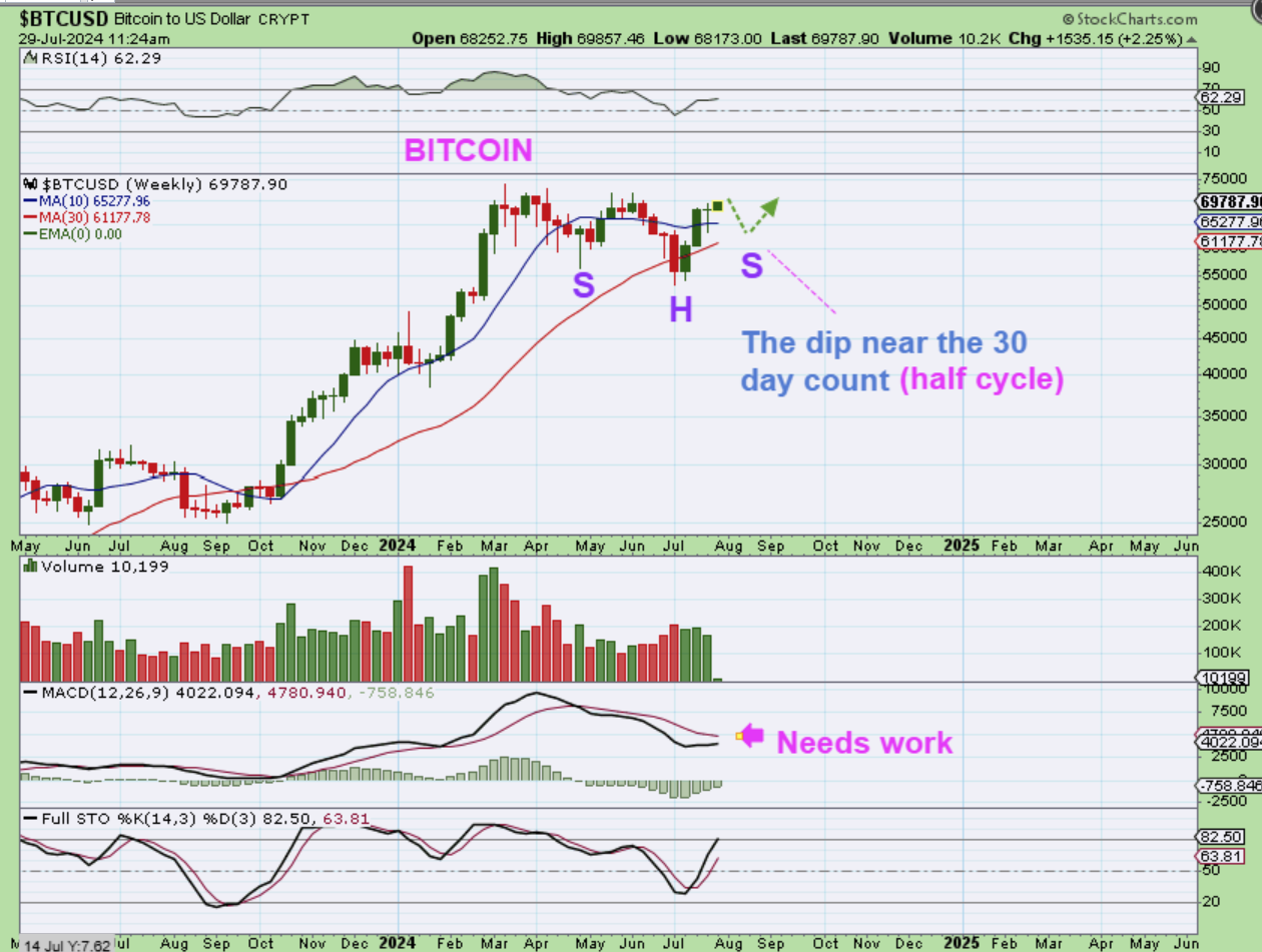 BITCOIN WEEKLY – I also grabbed this chart before the pullback started yesterday, because I just wanted to show an idea where the dip into day 30, if it goes deep enough, could form an inverse H&S. THAT would be a nice set up for the run higher with the full 60 day daily cycle, but we would need a dip to that $60,000 – $65,000 area.