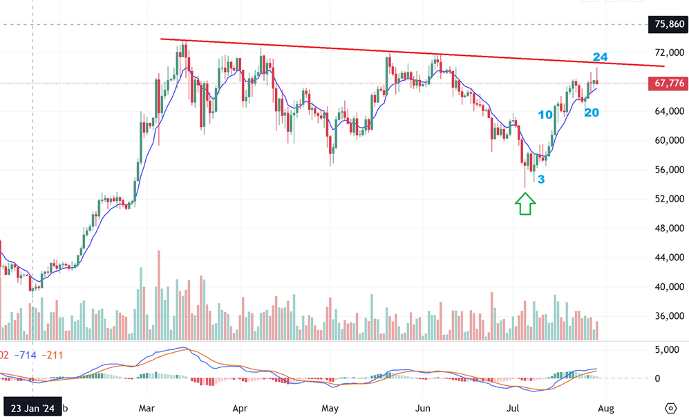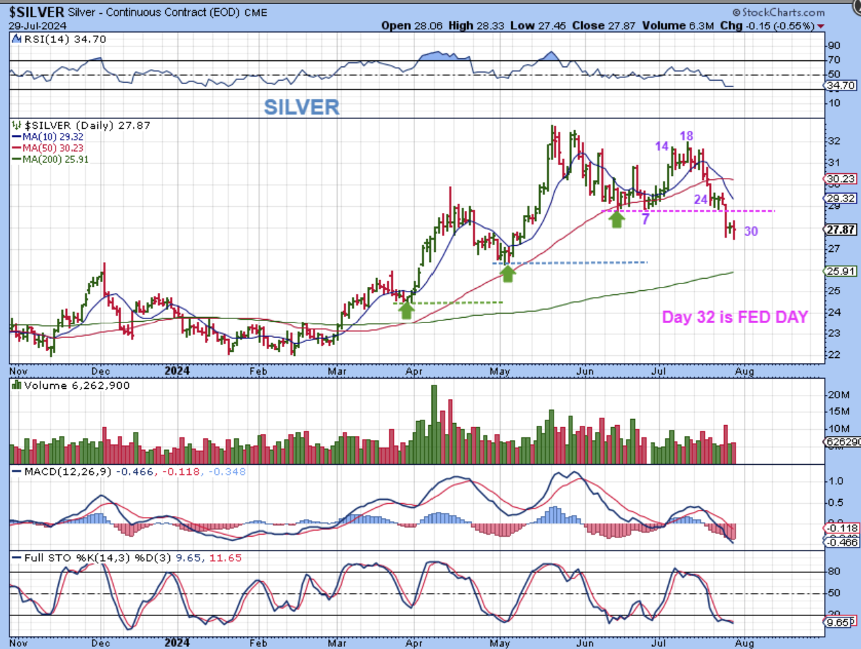 BITCOIN didn’t quite make it to the $71,000 that I was looking for at that line, but it did tag the lower target of $70,000 (round numbers often do cause selling) and then started that sell off. We’ll see if this continues to pull back into the Fed Mtg around day 27 and then start higher from there. Bitcoin CAN bottom sooner, since that day 30 is plus or minus a few days.