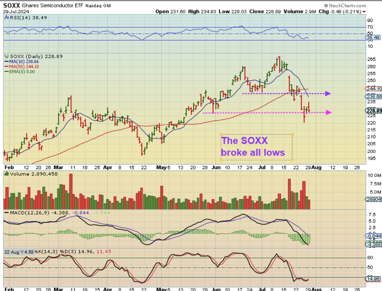 THE NASDAQ lost the 50sma and is still below it. That MACD looks like a wide-mouthed bass and it will be interesting to see if the Fed Mtg can cause a recovery, but right now I see more weakness here. Next comes the SOXX…