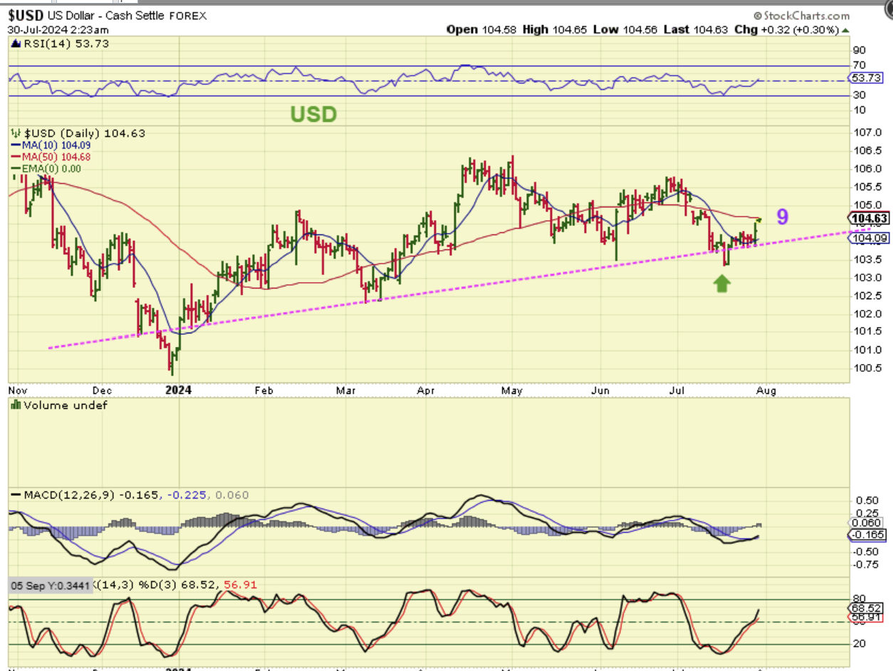 THE USD has put in a dcl and is on day 9. I am actually expecting the USD to roll over again, with talk of a rate cut and that could help Gold, Silver, and the Miners to bottom.