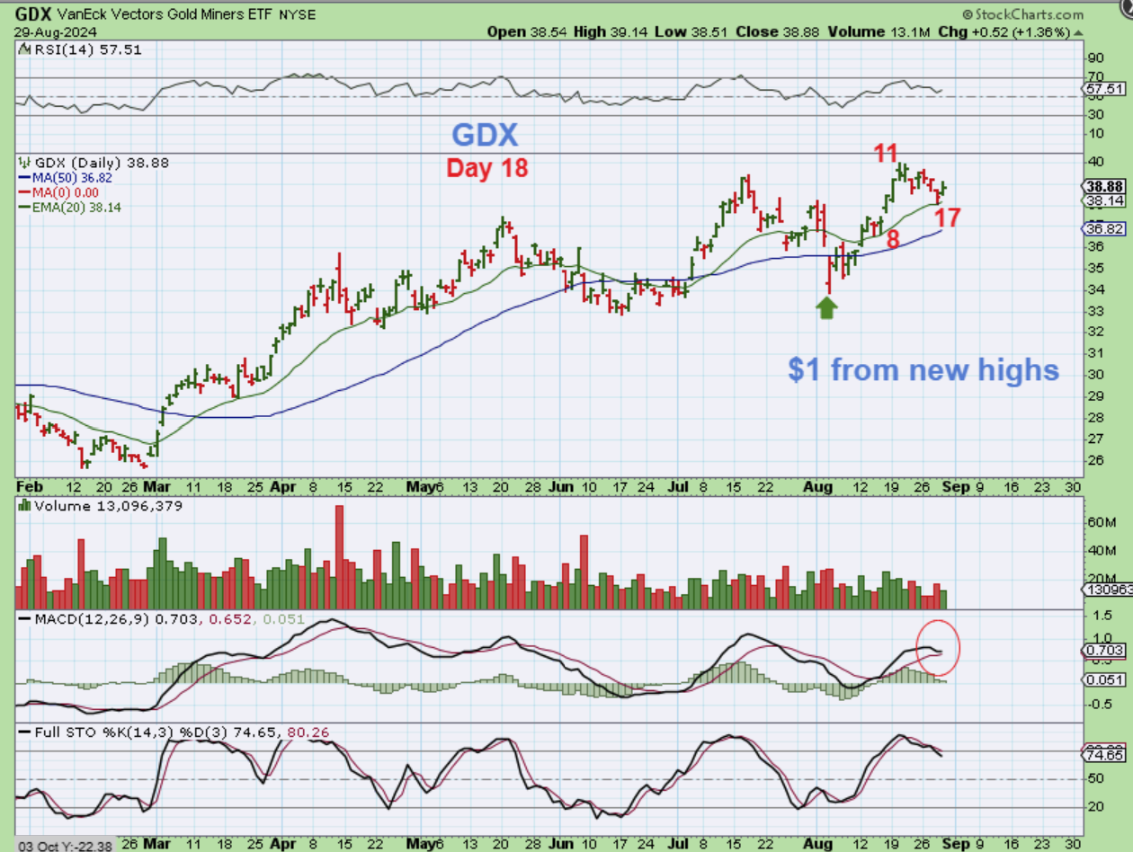 GDX looks like a bull flag and dipped to the 20ema and reversed there. It has a day 11 peak though, so I really want to see another push higher to give us a new peak in this daily cycle. We are only about $1 from new highs at $40.