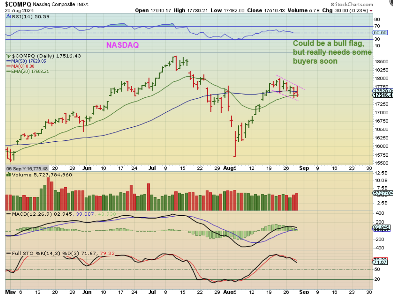 NASDAQ – After the NVDA earnings and Jobless claims, we got a rally that brought price back up above the 50sma on the Nasdaq, but then it suddenly sold off in the final 2 hrs of the day. This DOES look like a ‘bull flag’, but it also looks like it can’t hold the gains, and the sellers are selling into the buying, as the struggle at the 50sma continues.