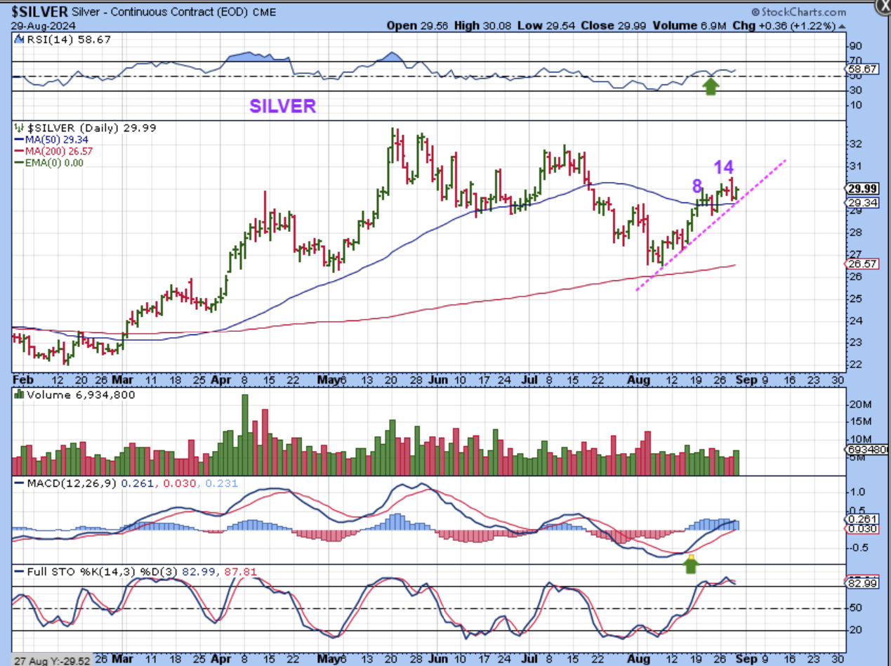 SILVER made a new peak on Wednesday, day 14 and then dipped to the 50sma. That didn’t look very good, but Silver has a trendline forming and that helped price to reverse right at the 50 sma. So Silver does look pretty good here, holding the 50sma and slowly climbing up and along a fairly steep trendline.