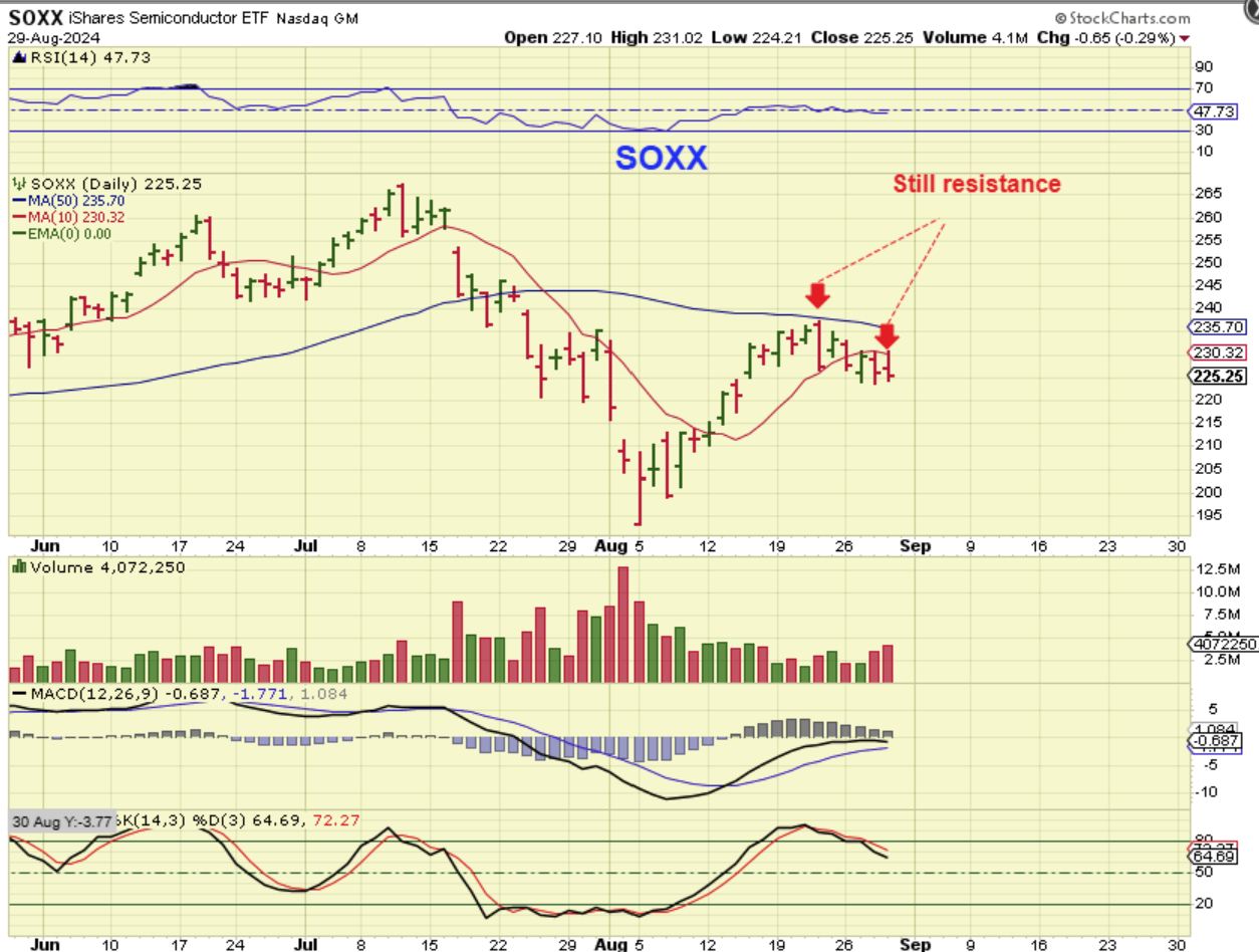 The SOXX still cannot recover yet. Yesterday the SOXX rallied too, but closed near the lows of the day after selling off all afternoon. This looks a bit less like a bull flag and more like an inability to regain the 50sma (& also a rejection at the 10sma for 3 days in a row. This looks weak.