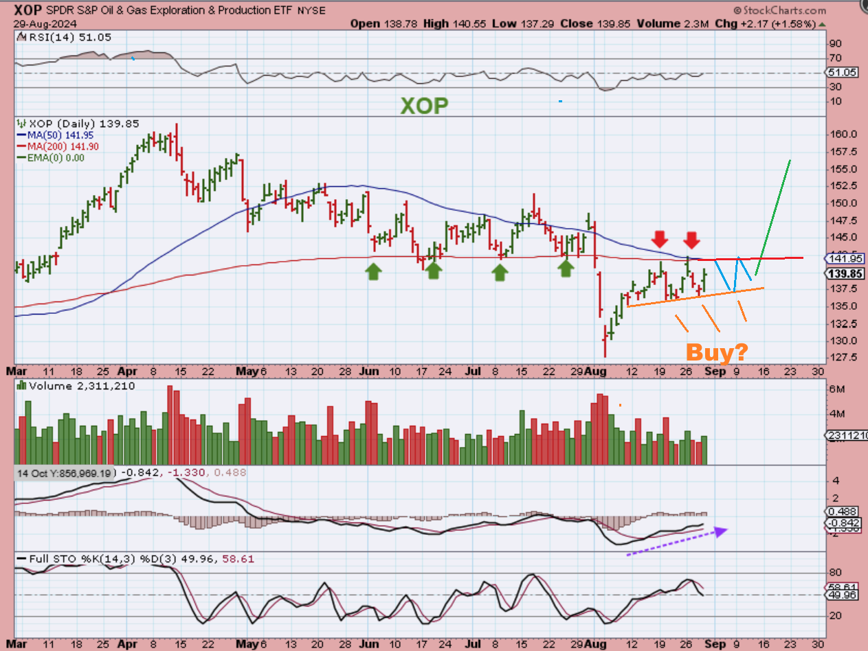 If someone was interested in this XOP set up, they could buy with a stop at the lows if it drops & reverses again in this crawl, or buy the breakout if or when that happens.