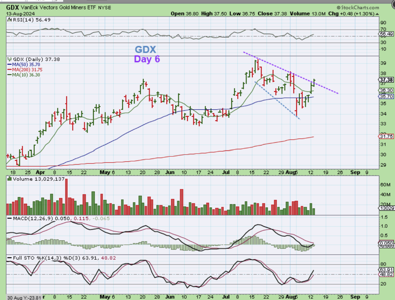 GDX is on day 6 and it is moving nicely out of the lows. I am expecting new highs here too, but you can see that the GDX did get caught in that 2 day sell off. That may be simply because it was weak and due for a dcl.