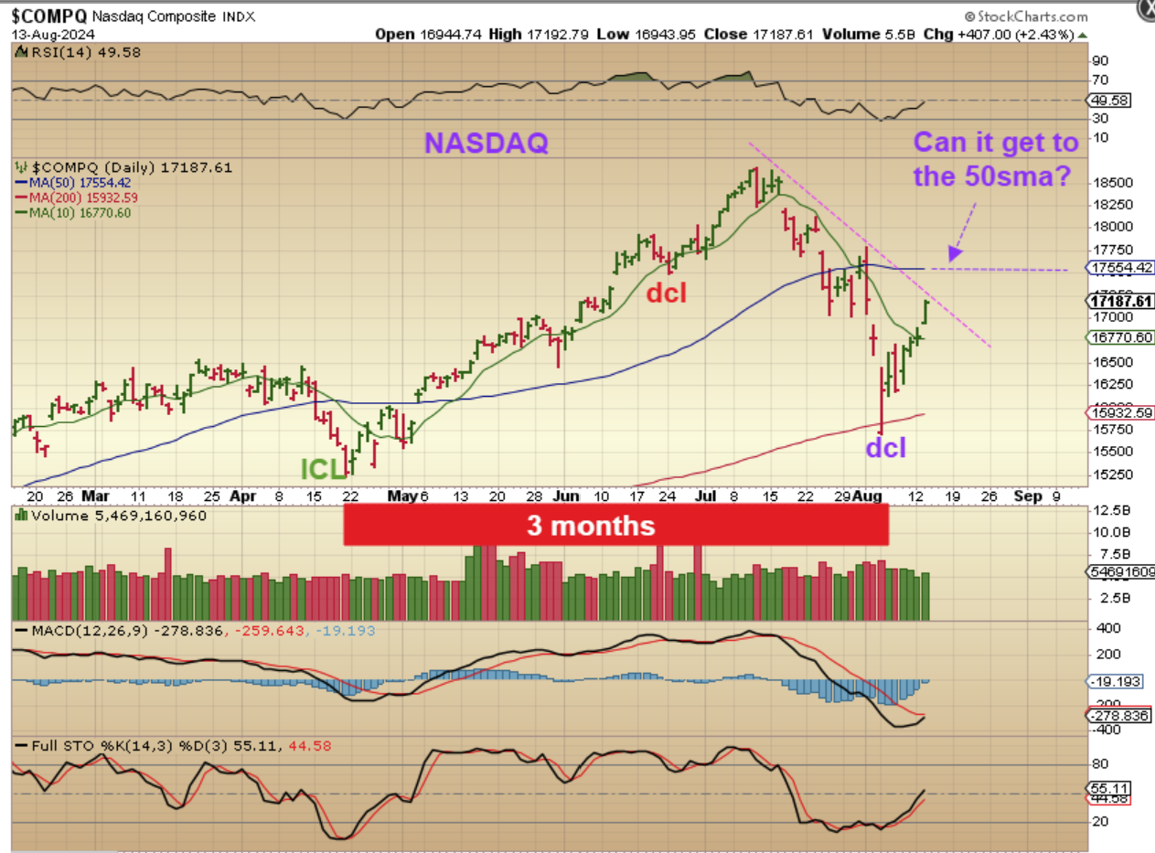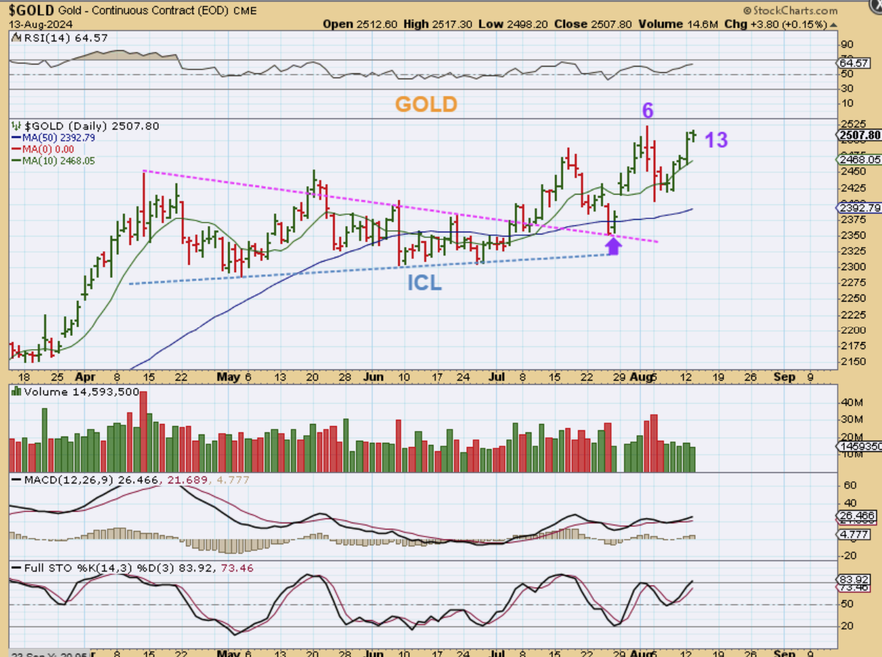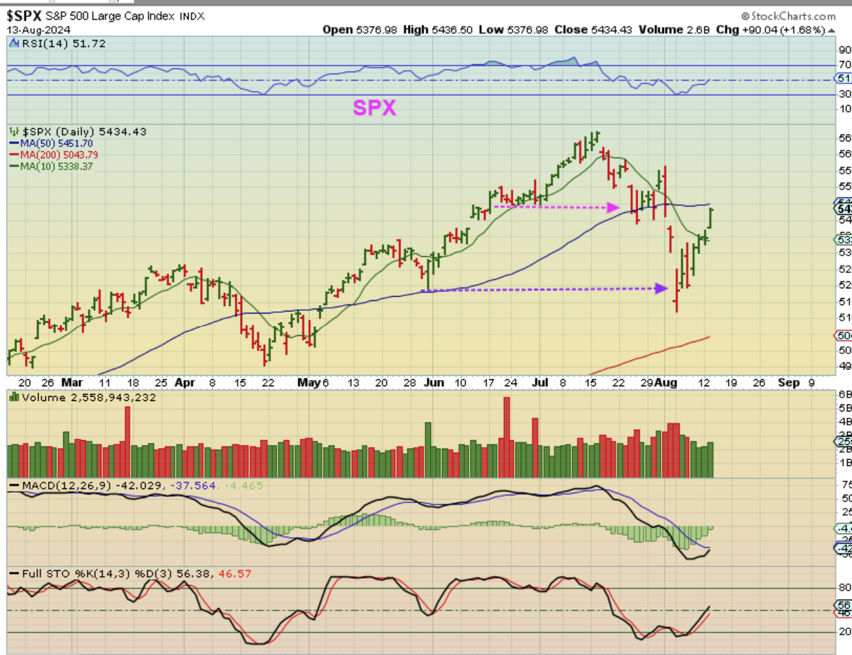 DATA: The PPI Numbers came in milder than expected, meaning that inflation is dropping and a rate cut is needed to slow things down. That was bullish for the markets and Gold. Today is the CPI Numbers and low numbers there could continue the party out of the lows, high numbers could cause some selling. That said, Thursday will also be a hurdle. Remember that we rallied after the Fed Mtg Wednesday into the close, and the charts looked great–and then sold off Thursday and Friday with economic concerns. Let’s go to the charts and discuss the set up…