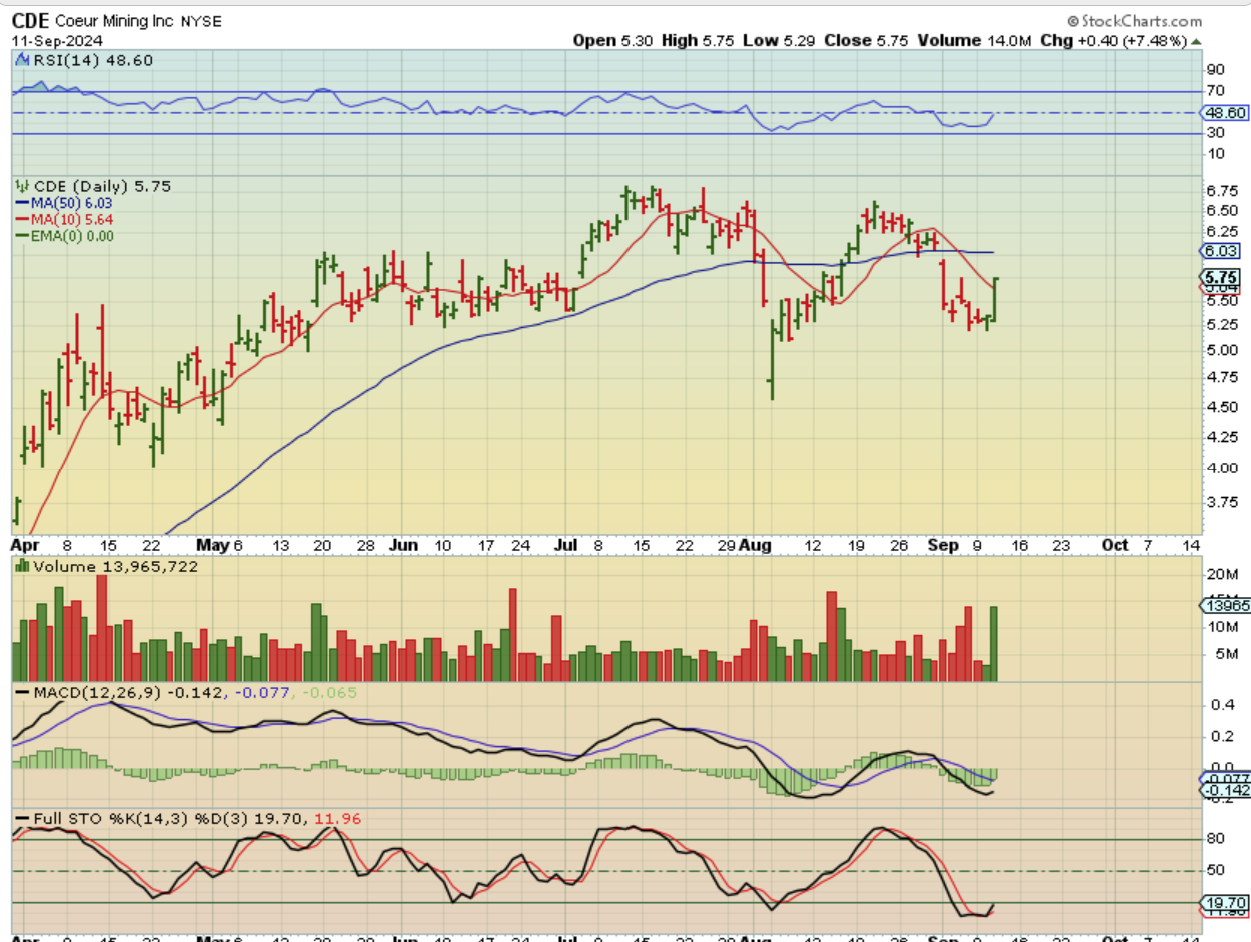 CDE is oversold and also popped about 7.5%, so the silver stocks started to react nicely, even though the metals themselves only moved up a little bit. Maybe Miners are going to lead this sector higher?