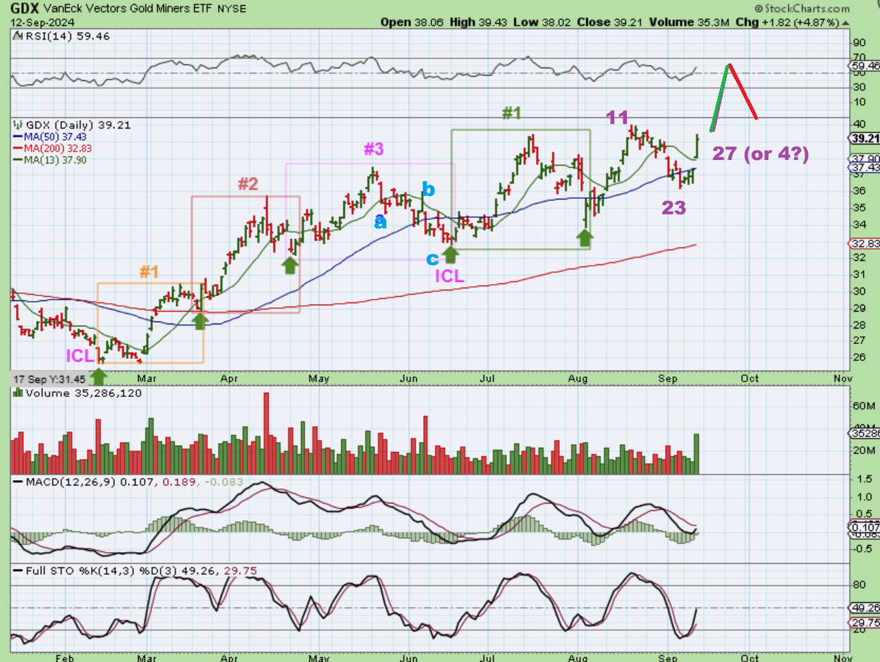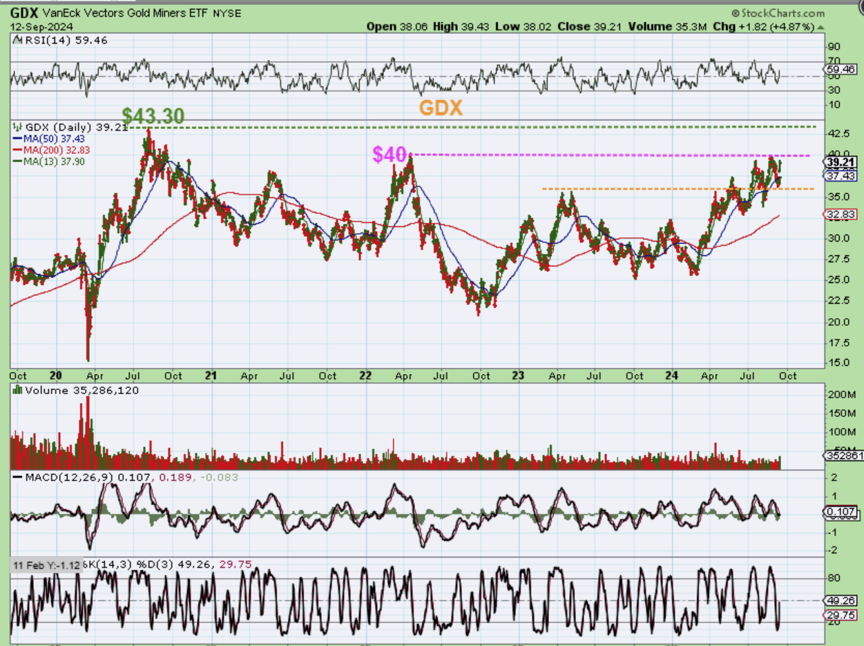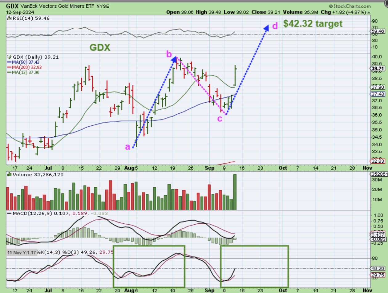 The possible ‘measured move’ for GDX is in the $42.32 area, but it can extend using Fib levels. This was a big 5% day with huge volume. GDX is NOT overbought.