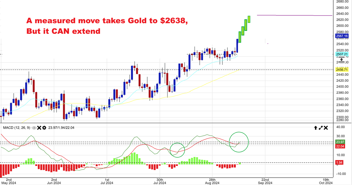 Do we have a measured move? One measured move would be to $2638, but these targets can extend if Silver takes off and drags Gold higher with it. Is Silver Bullish enough to do that? Yes, it really is…