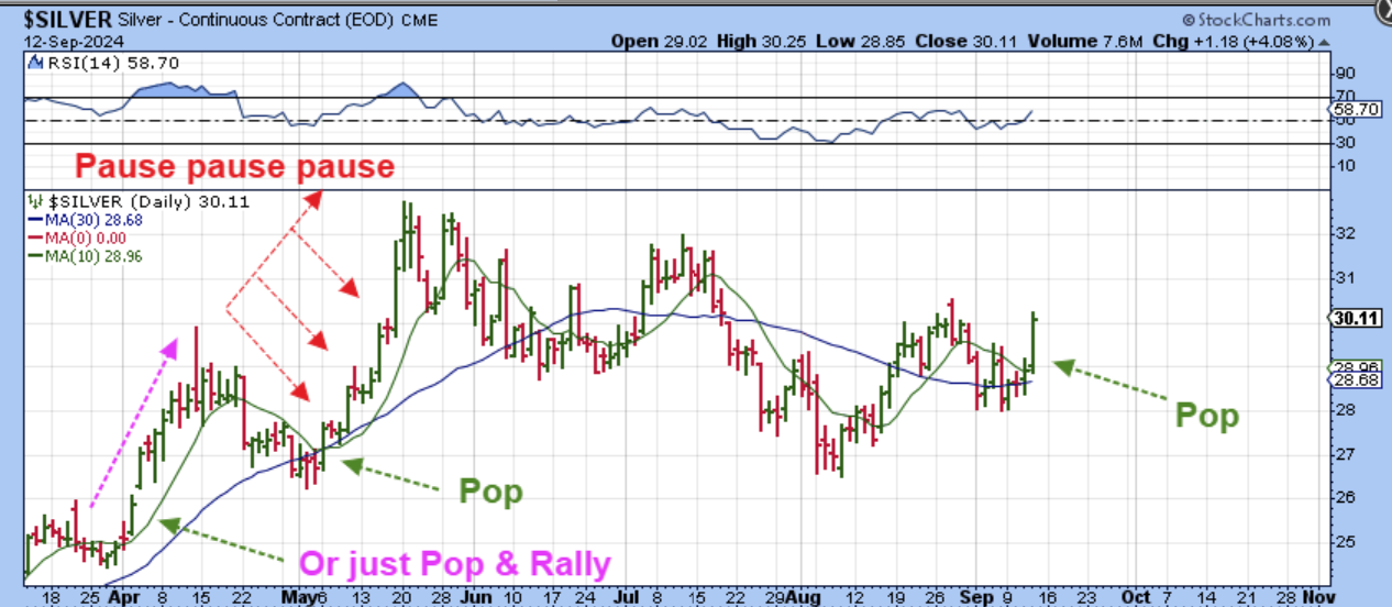 No, Silver is known to either Pop and run in the past, or it can Pop – Pause – Pop – Pause, as seen on this chart below.