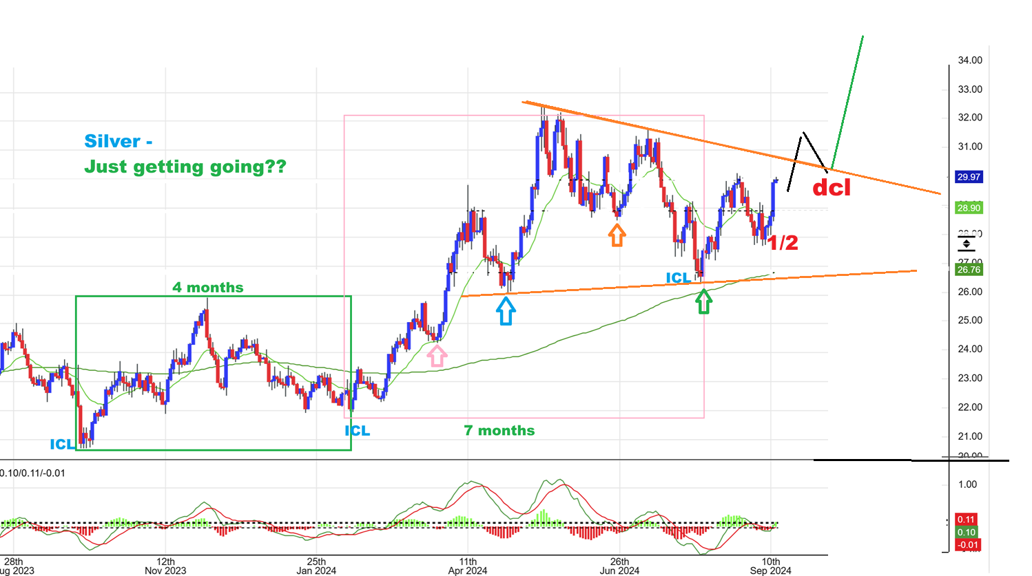 4. Silver does look to have an ICL in place at that prior low on the 30 week ma, meaning that we have a good amount of ‘Time’ in this intermediate cycle to fly. .