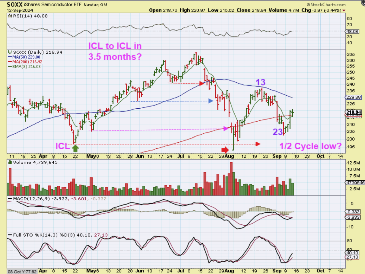 THE SOXX was the weak area, so I want to start here first. We had an ICL in April and the SOXX rolled over quickly and broke very other low from the initial rally. This gives us ‘Failed’ dcls. Now notice that the SOXX crashed in July to NEW LOWS BELOW THE ICL. THAT is bearish and it also seems too early for a new ICL (3.5 months), but a bounce was due, so I said that we would watch it as maybe a day 23 1/2 cycle low. I want to see if price ‘tags’ the 50 sma and drops or gets above it…