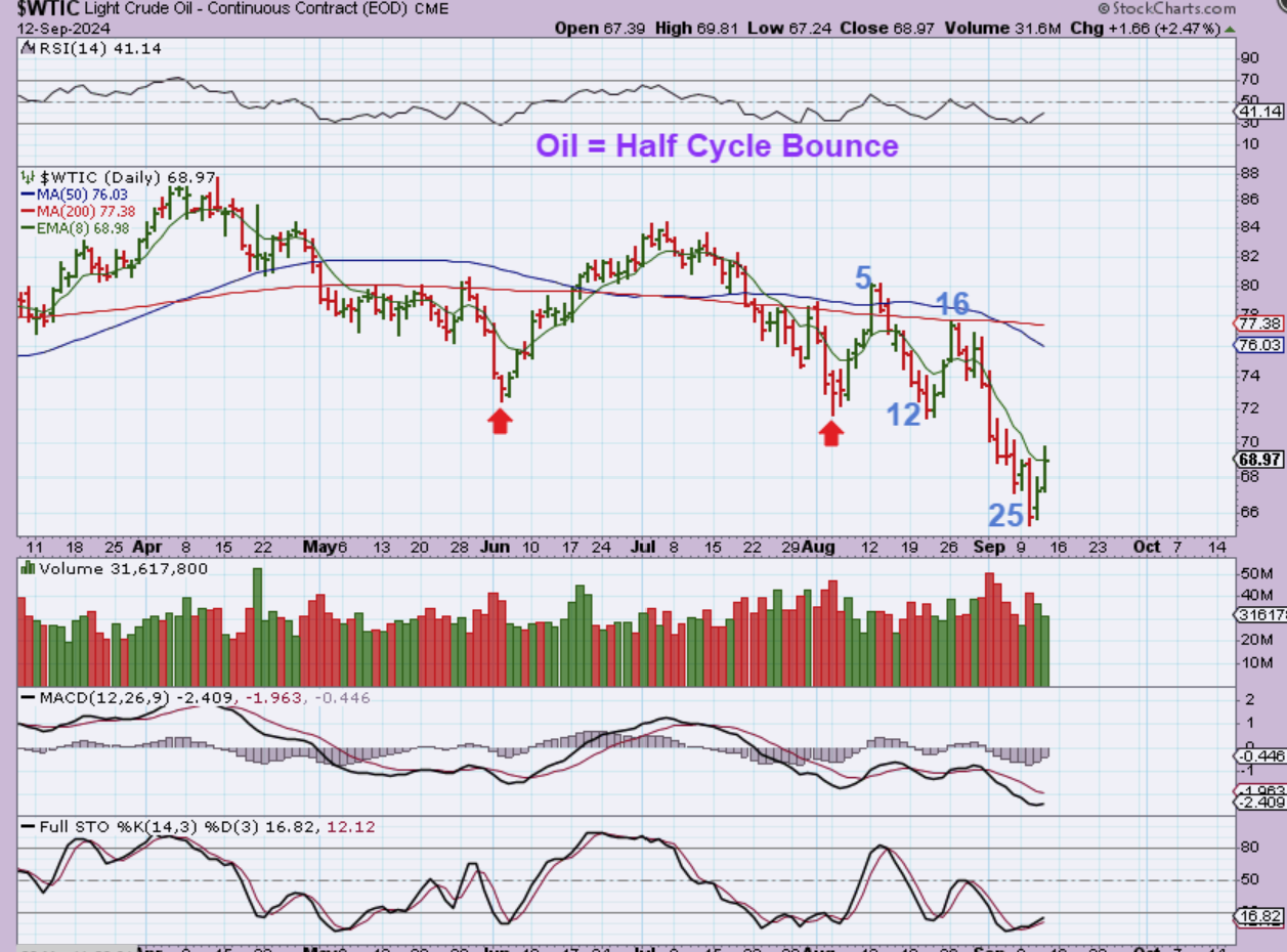 WTIC – Oil is bouncing and it could even bounce to the 50sma, but it really is too early for a dcl, so that day 25 low is probably a half cycle low.