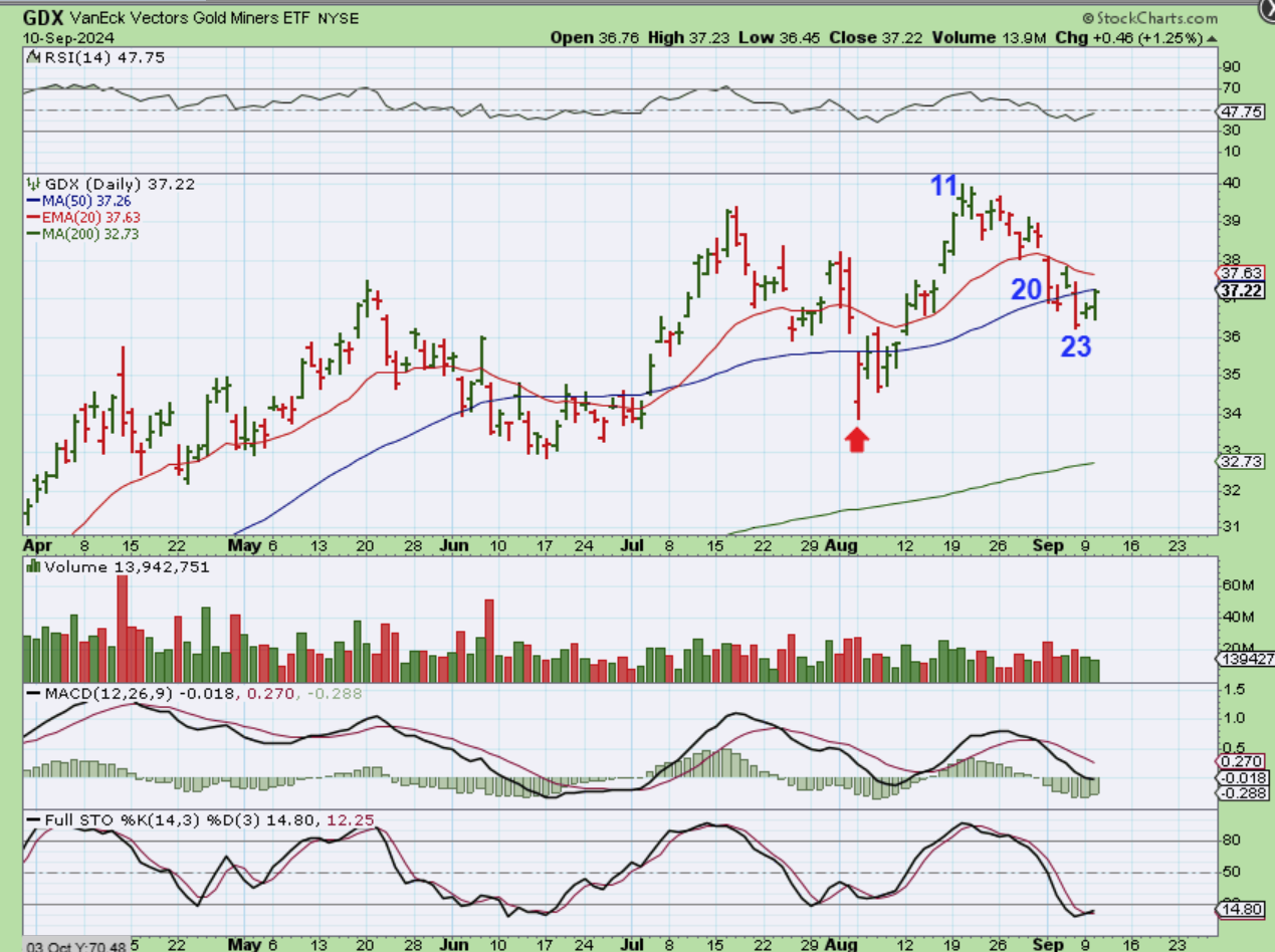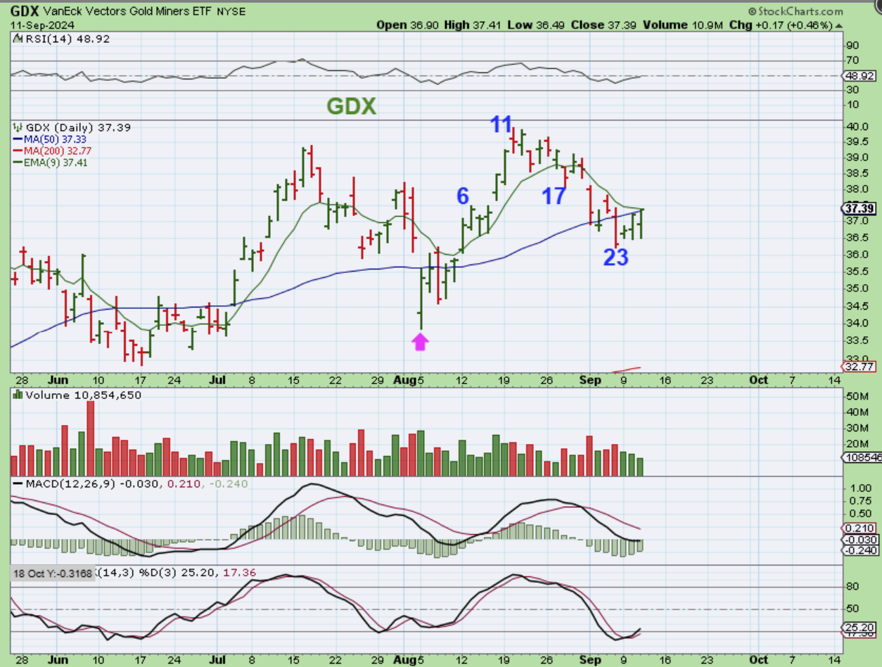 THE GDX seemed to follow the General Markets again and is now pushing on the 50sma. Notice a dat 23 low, tht seems too early for a dcl…
