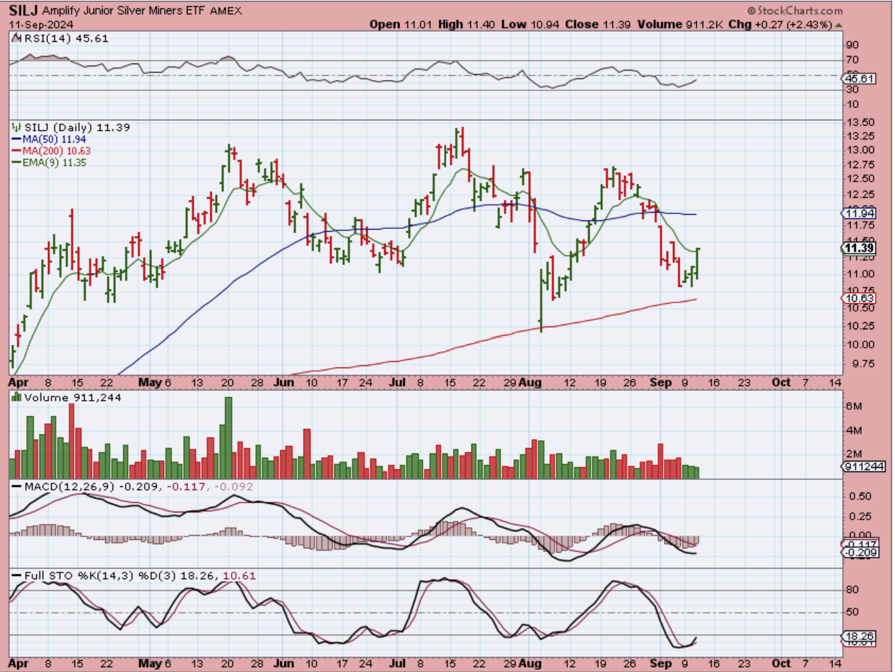 Take a look at the SILJ ETF for example. That was a nice move compared to Silvers move. SILJ is oversold too.