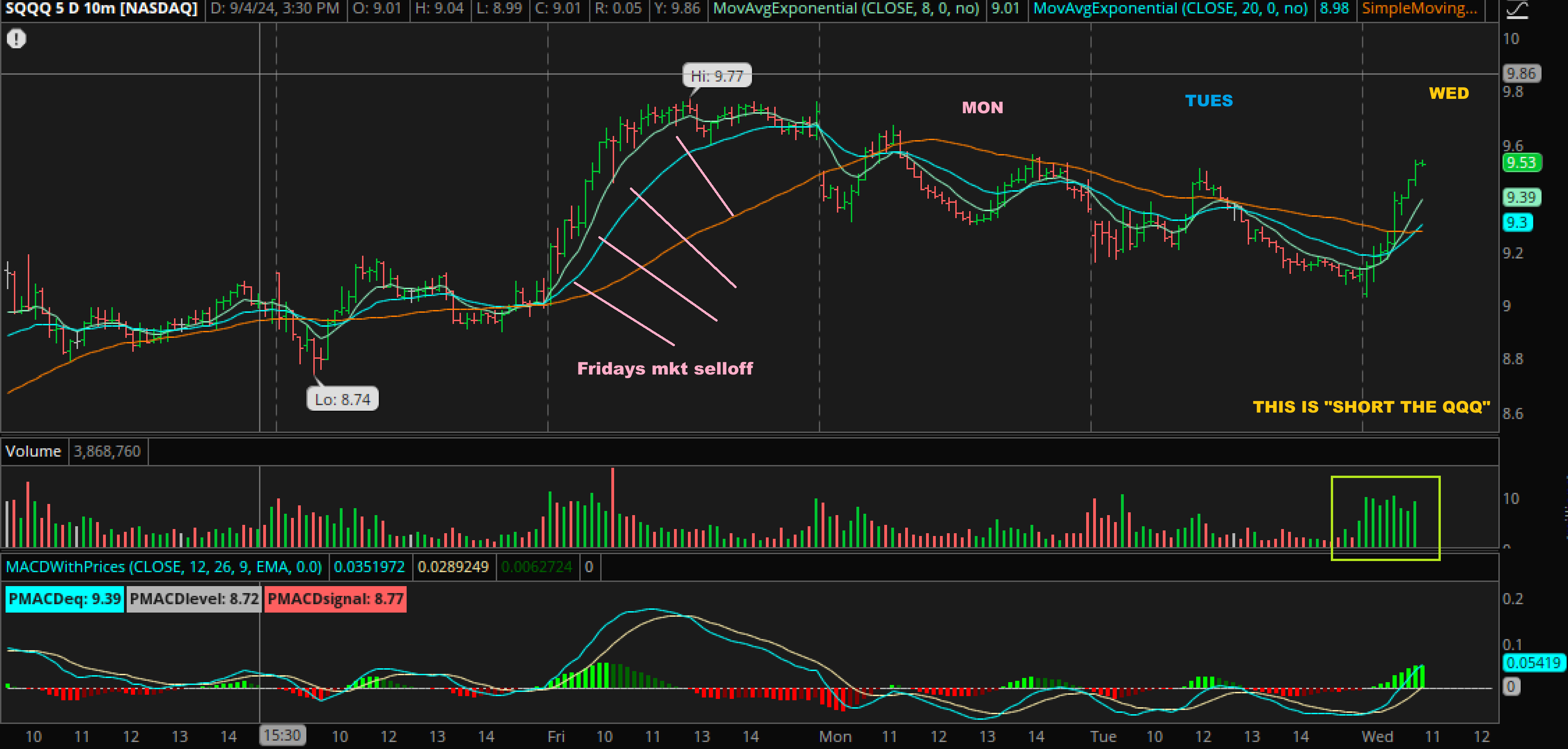 This was the SQQQ (short the markets) Intraday chart and I had grabbed SOXS at about 1/2 of this move near the red line. As a 5 minute chart, this is showing you that every 5 minutes we saw selling in the QQQ and buying in the SQQQ. Last Friday the selling lasted all day so I was short thinking that we were going to see that, and suddenly it just turned around FAST. I sold my SOXS and flipped to long Crypto stocks and 2 Silver stocks.