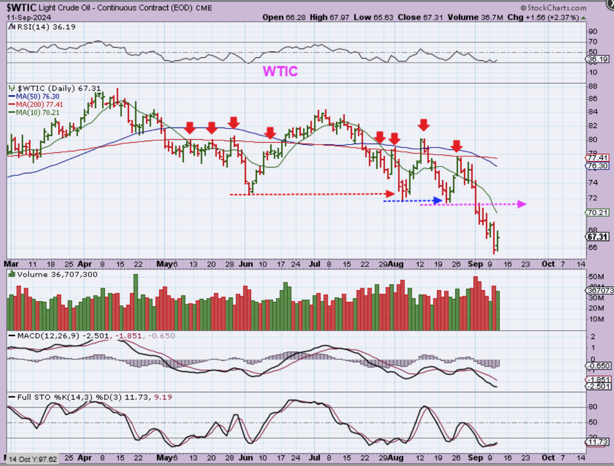 WTIC – Oil may bounce, but it is not quite due for a dcl, so I expect more downside.