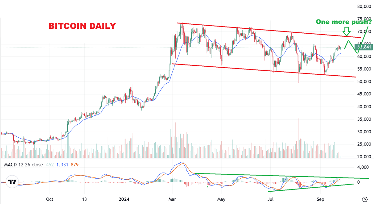 We still have time for a run higher, but now it starts to get late. I DO SEE IMPROVEMNET IN THE MACD ON THIS RUN. We could be setting up for that breakout (FINALLY) soon, after a day 60ish dip. Some Crypto stocks are firming up too.