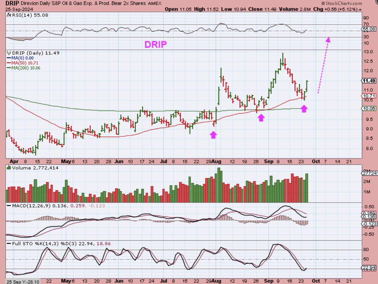 DRIP has made a couple of nice runs with Oils sell offs. It reversed right at the 50sma. If Oil just sells off into a dcl, this could rally steadily like it did in August and September. NOTE: Drip is a 2x, so it can be risky as a leveraged vehicle.